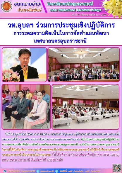วันที่ 11 กุมภาพันธ์ 2568 เวลา 09.30 น. นายธาตรี พิบูลมณฑา ผู้อำนวยการวิทยาลัยเทคนิคอุบลราชธานี มอบหมายให้ นางอรทัย ซาเสน หัวหน้างานวางแผนและงบประมาณ เข้าร่วมการประชุมเชิงปฏิบัติการการระดมความคิดเห็นในการจัดทำแผนพัฒนาเทศบาลนครอุบลราชธานี ณ สำนักงานเทศบาลนครอุบลราชธานี ในการนี้ได้รับเกียรติจาก นายญาณวุฒิ เพทายพนากิจ ปลัดเทศบาลนครอุบลราชธานี ปฏิบัติหน้าที่นายกเทศมนตรีนครอุบลราชธานี เป็นประธานในการประชุม ทั้งนี้เพื่อพิจารณาร่างแผนพัฒนาท้องถิ่น (พ.ศ. 2566 – 2570) เทศบาลนครอุบลราชธานี เพิ่มเติมครั้งที่ 1/2568 ต่อไป