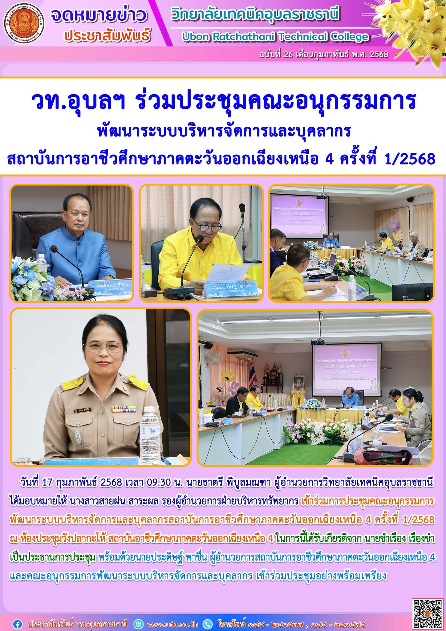 วันที่ 17 กุมภาพันธ์ 2568 เวลา 09.30 น. นายธาตรี พิบูลมณฑา ผู้อำนวยการวิทยาลัยเทคนิคอุบลราชธานีได้มอบหมายให้ นางสาวสายฝน สาระผล รองผู้อำนวยการฝ่ายบริหารทรัพยากร เข้าร่วมการประชุมคณะอนุกรรมการพัฒนาระบบบริหารจัดการและบุคลากรสถาบันการอาชีวศึกษาภาคตะวันออกเฉียงเหนือ 4 ครั้งที่ 1/2568 ณ ห้องประชุมวังปลากะโห้ สถาบันอาชีวศึกษาภาคตะวันออกเฉียงเหนือ 4 ในการนี้ได้รับเกียรติจาก นายชำเรือง เรืองขำ เป็นประธานการประชุม พร้อมด้วยนายประดิษฐ์ พาชื่น ผู้อำนวยการสถาบันการอาชีวศึกษาภาคตะวันออกเฉียงเหนือ 4 และคณะอนุกรรมการพัฒนาระบบบริหารจัดการและบุคลากร เข้าร่วมประชุมอย่างพร้อมเพรียง