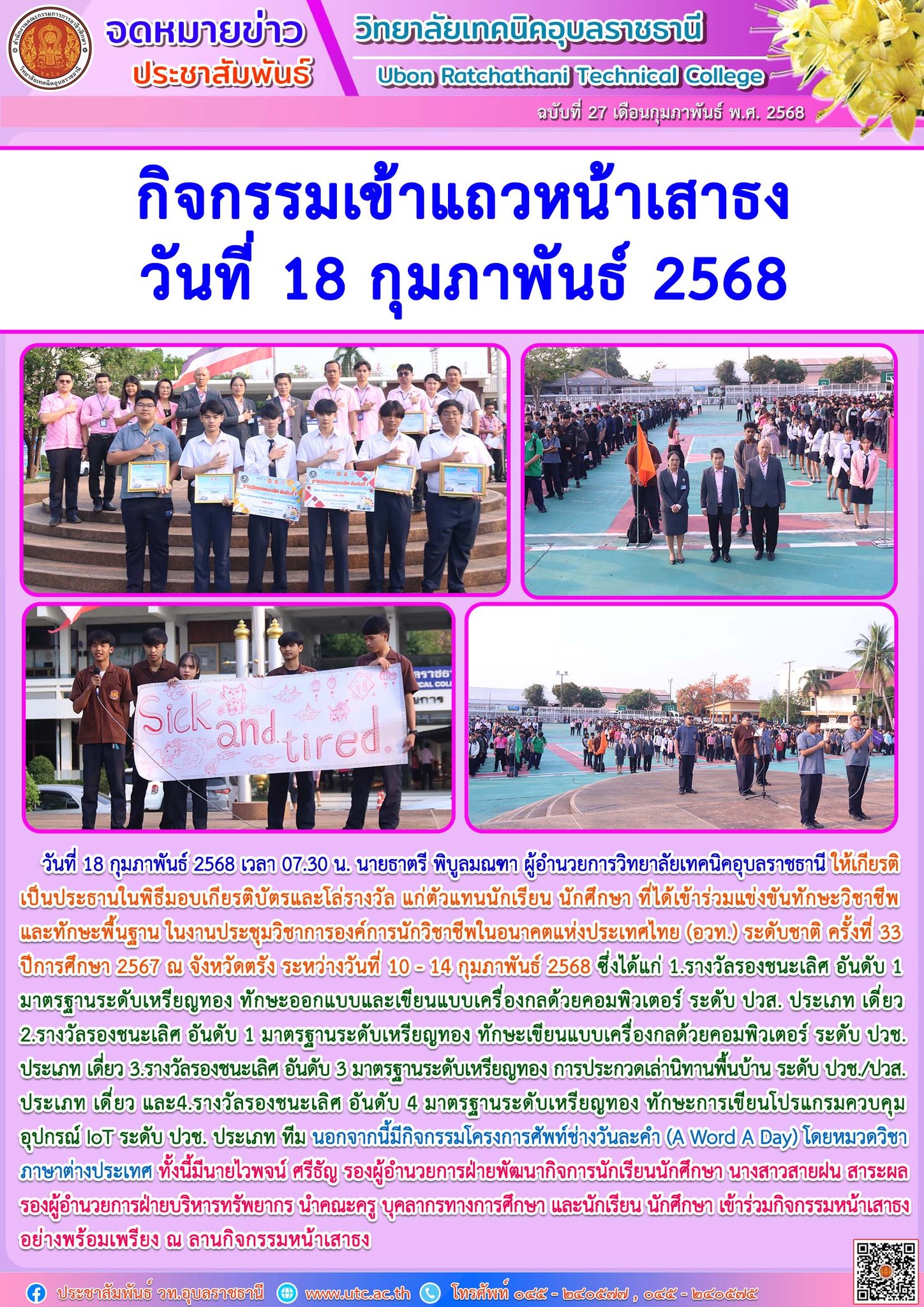 วันที่ 18 กุมภาพันธ์ 2568 เวลา 07.30 น. นายธาตรี พิบูลมณฑา ผู้อำนวยการวิทยาลัยเทคนิคอุบลราชธานี ให้เกียรติเป็นประธานในพิธีมอบเกียรติบัตรและโล่รางวัล แก่ตัวแทนนักเรียน นักศึกษา ที่ได้เข้าร่วมแข่งขันทักษะวิชาชีพและทักษะพื้นฐาน ในงานประชุมวิชาการองค์การนักวิชาชีพในอนาคตแห่งประเทศไทย (อวท.) ระดับชาติ ครั้งที่ 33 ปีการศึกษา 2567 ณ จังหวัดตรัง ระหว่างวันที่ 10 – 14 กุมภาพันธ์ 2568 ซึ่งได้แก่ 1.รางวัลรองชนะเลิศ อันดับ 1 มาตรฐานระดับเหรียญทอง ทักษะออกแบบและเขียนแบบเครื่องกลด้วยคอมพิวเตอร์ ระดับ ปวส. ประเภท เดี่ยว 2.รางวัลรองชนะเลิศ อันดับ 1 มาตรฐานระดับเหรียญทอง ทักษะเขียนแบบเครื่องกลด้วยคอมพิวเตอร์ ระดับ ปวช. ประเภท เดี่ยว 3.รางวัลรองชนะเลิศ อันดับ 3 มาตรฐานระดับเหรียญทอง การประกวดเล่านิทานพื้นบ้าน ระดับ ปวช./ปวส. ประเภท เดี่ยว และ4.รางวัลรองชนะเลิศ อันดับ 4 มาตรฐานระดับเหรียญทอง ทักษะการเขียนโปรแกรมควบคุมอุปกรณ์ IoT ระดับ ปวช. ประเภท ทีม นอกจากนี้มีกิจกรรมโครงการศัพท์ช่างวันละคำ (A Word A Day) โดยหมวดวิชาภาษาต่างประเทศ ทั้งนี้มีนายไวพจน์ ศรีธัญ รองผู้อำนวยการฝ่ายพัฒนากิจการนักเรียนนักศึกษา นางสาวสายฝน สาระผล รองผู้อำนวยการฝ่ายบริหารทรัพยากร นำคณะครู บุคลากรทางการศึกษา และนักเรียน นักศึกษา เข้าร่วมกิจกรรมหน้าเสาธงอย่างพร้อมเพรียง ณ ลานกิจกรรมหน้าเสาธง