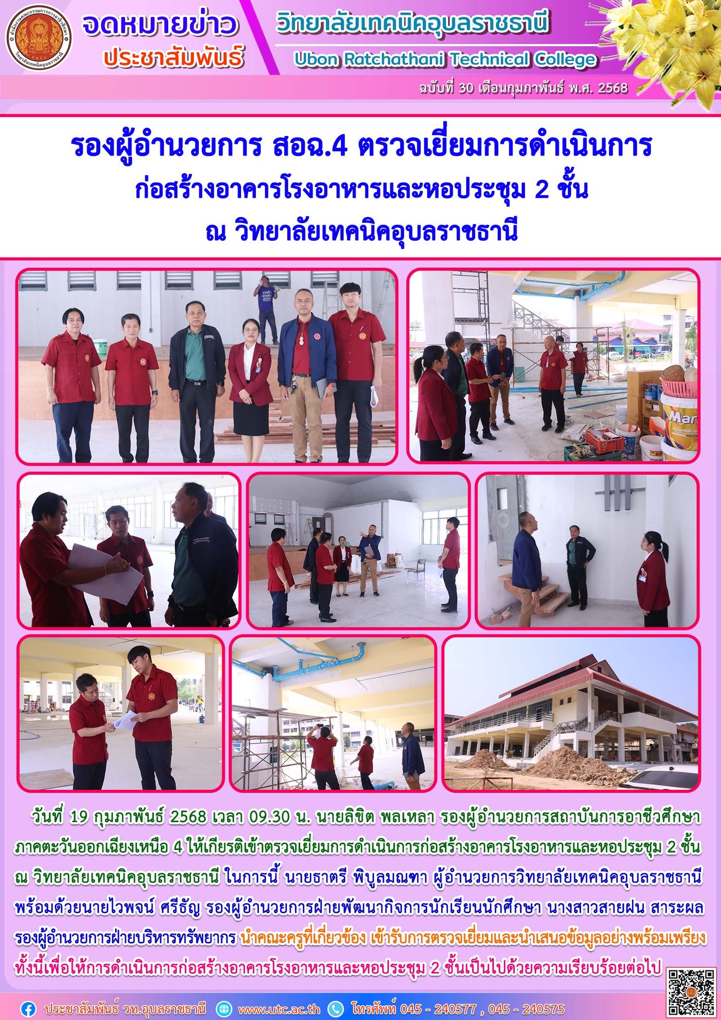วันที่ 19 กุมภาพันธ์ 2568 เวลา 09.30 น. นายลิขิต พลเหลา รองผู้อำนวยการสถาบันการอาชีวศึกษาภาคตะวันออกเฉียงเหนือ 4 ให้เกียรติเข้าตรวจเยี่ยมการดำเนินการก่อสร้างอาคารโรงอาหารและหอประชุม 2 ชั้น ณ วิทยาลัยเทคนิคอุบลราชธานี ในการนี้มีนายธาตรี พิบูลมณฑา ผู้อำนวยการวิทยาลัยเทคนิคอุบลราชธานี พร้อมด้วยนายไวพจน์ ศรีธัญ รองผู้อำนวยการฝ่ายพัฒนากิจการนักเรียนนักศึกษา นางสาวสายฝน สาระผล รองผู้อำนวยการฝ่ายบริหารทรัพยากร นำคณะครูที่เกี่ยวข้อง เข้ารับการตรวจเยี่ยมและนำเสนอข้อมูลอย่างพร้อมเพรียง ทั้งนี้เพื่อให้การดำเนินการก่อสร้างอาคารโรงอาหารและหอประชุม 2 ชั้นเป็นไปด้วยความเรียบร้อยต่อไป