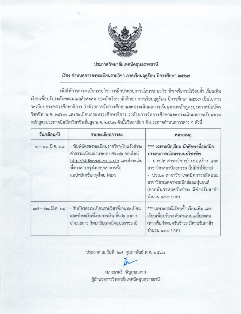 ประกาศวิทยาลัยเทคนิคอุบลราชธานี เรื่อง กำหนดการลงทะเบียนรายวิชา ภาคเรียนฤดูร้อน ปีการศึกษา 2567