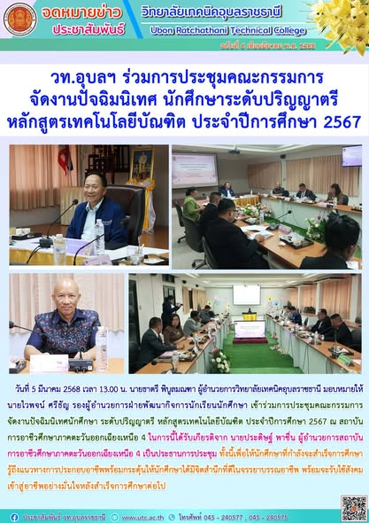 วันที่ 5 มีนาคม 2568 เวลา 13.00 น. นายธาตรี พิบูลมณฑา ผู้อำนวยการวิทยาลัยเทคนิคอุบลราชธานี มอบหมายให้ นายไวพจน์ ศรีธัญ รอง ผู้อำนวยการฝ่ายพัฒนากิจการนักเรียนนักศึกษา เข้าร่วมการประชุมคณะกรรมการจัดงานปัจฉิมนิเทศ นักศึกษาระดับปริญญาตรี หลักสูตรเทคโนโลยีบัณฑิต ประจำปีการศึกษา 2567 ณ สถาบันการอาชีวศึกษาภาคตะวันออกเฉียงเหนือ 4 ในการนี้ได้รับเกียรติจาก นายประดิษฐ์ พาชื่น ผู้อำนวยการสถาบันการอาชีวศึกษาภาคตะวันออกเฉียงเหนือ 4 เป็นประธานการประชุม ทั้งนี้เพื่อให้นักศึกษาที่กำลังจะสำเร็จการศึกษารู้ถึงแนวทางการประกอบอาชีพพร้อมกระตุ้นให้นักศึกษาได้มีจิตสำนึกที่ดีในจรรยาบรรณอาชีพ พร้อมจะรับใช้สังคมเข้าสู่อาชีพอย่างมั่นใจหลังสำเร็จการศึกษาต่อไป