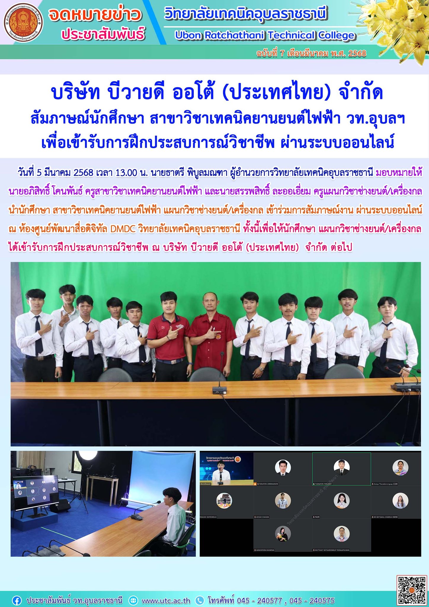 วันที่ 5 มีนาคม 2568 เวลา 13.00 น. นายธาตรี พิบูลมณฑา ผู้อำนวยการวิทยาลัยเทคนิค อุบลราชธานี มอบหมายให้ นายอภิสิทธิ์ โคนพันธ์ ครูสาขาวิชาเทคนิคยานยนต์ไฟฟ้า และนายสรรพสิทธิ์ ละออเอี่ยม ครูแผนกวิชาช่างยนต์/เครื่องกล นำนักศึกษา สาขาวิชาเทคนิคยานยนต์ไฟฟ้า แผนกวิชาช่างยนต์/เครื่องกล เข้าร่วมการสัมภาษณ์งาน ผ่านระบบออนไลน์ ณ ห้องศูนย์พัฒนาสื่อดิจิทัล DMDC วิทยาลัยเทคนิคอุบลราชธานี ทั้งนี้เพื่อให้นักศึกษา แผนกวิชาช่างยนต์/เครื่องกล ได้เข้ารับการฝึกประสบการณ์วิชาชีพ ณ บริษัท บีวายดี ออโต้ (ประเทศไทย) จำกัด ต่อไป