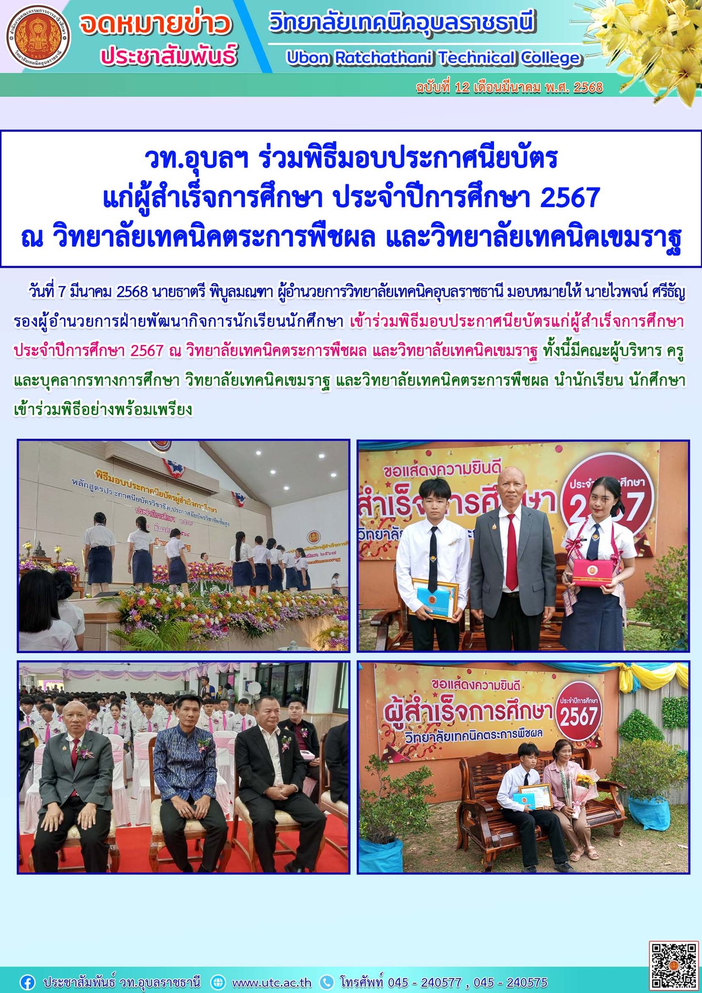 นที่ 7 มีนาคม 2568 นายธาตรี พิบูลมณฑา ผู้อำนวยการวิทยาลัยเทคนิคอุบลราชธานี มอบหมายให้ นายไวพจน์ ศรีธัญ รองผู้อำนวย การฝ่ายพัฒนากิจการนักเรียนนักศึกษา เข้าร่วมพิธีมอบประกาศนียบัตรแก่ผู้สำเร็จการศึกษา ประจำปีการศึกษา 2567 ณ วิทยาลัยเทคนิคเขมราฐ และวิทยาลัยเทคนิคตระการพืชผล ทั้งนี้มีคณะผู้บริหาร ครู และบุคลากรทางการศึกษา วิทยาลัยเทคนิคเขมราฐ และวิทยาลัยเทคนิคตระการพืชผล นำนักเรียน นักศึกษา เข้าร่วมพิธีอย่างพร้อมเพรียง