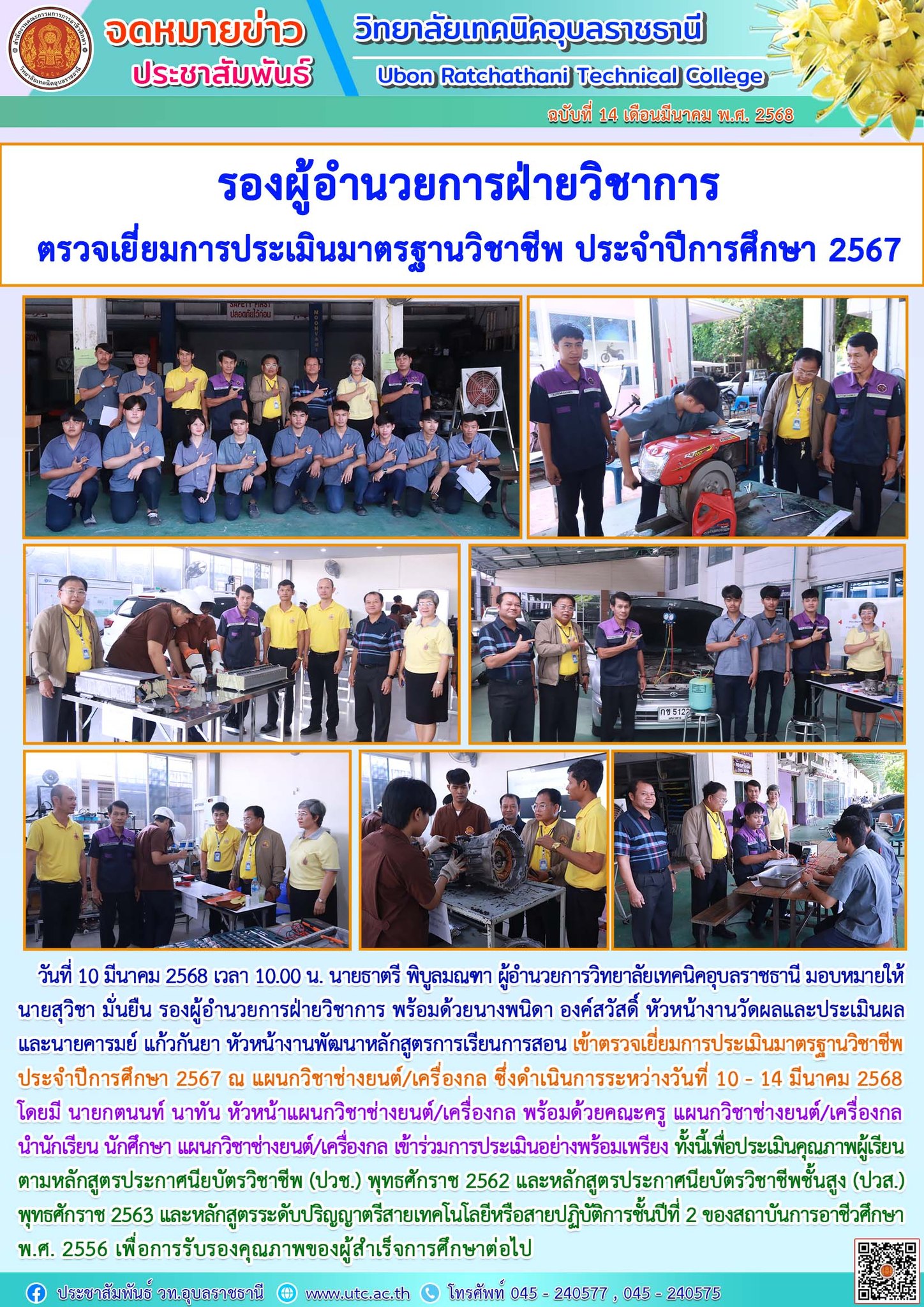 วันที่ 10 มีนาคม 2568 เวลา 10.00 น. นายธาตรี พิบูลมณฑา ผู้อำนวยการวิทยาลัยเทคนิคอุบลราชธานี มอบหมายให้ นายสุวิชา มั่นยืน รองผู้อำนวยการฝ่ายวิชาการ พร้อมด้วยนางพนิดา องค์สวัสดิ์ หัวหน้างานวัดผลและประเมินผล และนายคารมย์ แก้วกันยา หัวหน้างานพัฒนาหลักสูตรการเรียนการสอน เข้าตรวจเยี่ยมการประเมินมาตรฐานวิชาชีพ ประจำปีการศึกษา 2567 ณ แผนกวิชาช่างยนต์/เครื่องกล ซึ่งดำเนินการระหว่างวันที่ 10 – 14 มีนาคม 2568 โดยมี นายกตนนท์ นาทัน หัวหน้าแผนกวิชาช่างยนต์/เครื่องกล พร้อมด้วยคณะครู แผนกวิชาช่างยนต์/เครื่องกล นำนักเรียน นักศึกษา แผนกวิชาช่างยนต์/เครื่องกล เข้าร่วมการประเมินอย่างพร้อมเพรียง ทั้งนี้เพื่อประเมินคุณภาพผู้เรียนตามหลักสูตรประกาศนียบัตรวิชาชีพ (ปวช.) พุทธศักราช 2562 และหลักสูตรประกาศนียบัตรวิชาชีพชั้นสูง (ปวส.) พุทธศักราช 2563 และหลักสูตรระดับปริญญาตรีสายเทคโนโลยีหรือสายปฏิบัติการชั้นปีที่ 2 ของสถาบันการอาชีวศึกษา พ.ศ. 2556 เพื่อการรับรองคุณภาพของผู้สำเร็จการศึกษาต่อไป