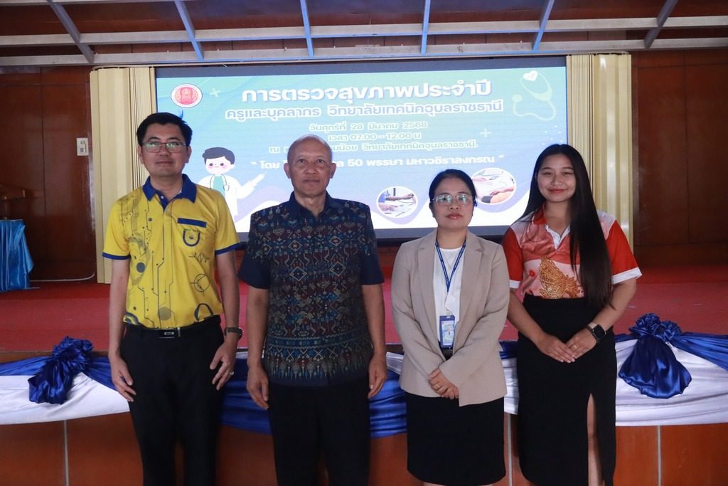 วันที่ 28 มีนาคม 2568 เวลา 09.00 น. นายธาตรี พิบูลมณฑา ผู้อำนวยการวิทยาลัยเทคนิคอุบลราชธานี มอบหมายให้ นายไวพจน์ ศรีธัญ รองผู้อำนวยการฝ่ายพัฒนากิจการนักเรียนนักศึกษา และนางสาวสายฝน สาระผล รองผู้อำนวยการฝ่ายบริหารทรัพยากร นำคณะครู และบุคลากรทางการศึกษา เข้าร่วมการตรวจสุขภาพประจำปี ครูและบุคลากร วิทยาลัยเทคนิคอุบลราชธานี ณ หอประชุมโดมน้อย โดยได้รับความอนุเคราะห์คณะแพทย์ พยาบาล และเจ้าหน้าที่จาก โรงพยาบาล 50 พรรษา มหาวชิราลงกรณ มาให้บริการตรวจสุขภาพ ทั้งนี้มีคณะครู และบุคลากรทางการศึกษา เข้าร่วมกิจกรรมอย่างพร้อมเพรียง
