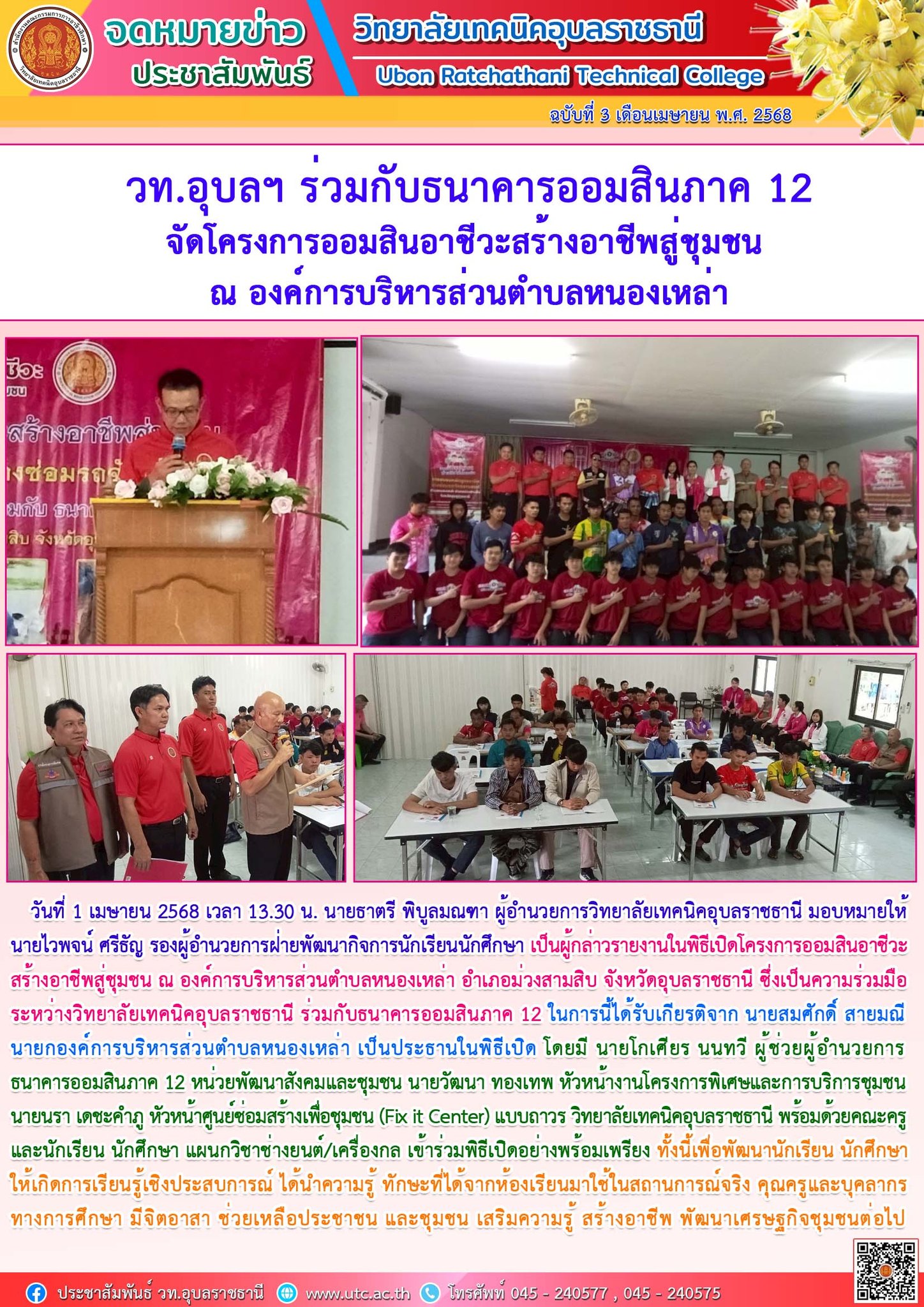 วันที่ 1 เมษายน 2568 เวลา 13.30 น. นายธาตรี พิบูลมณฑา ผู้อำนวยการวิทยาลัยเทคนิคอุบลราชธานี มอบหมายให้นายไวพจน์ ศรีธัญ รองผู้อำนวยการฝ่ายพัฒนากิจการนักเรียนนักศึกษา เป็นผู้กล่าวรายงานในพิธีเปิดโครงการออมสินอาชีวะสร้างอาชีพสู่ชุมชน ณ องค์การบริหารส่วนตำบลหนองเหล่า อำเภอม่วงสามสิบ จังหวัดอุบลราชธานี ซึ่งเป็นความร่วมมือระหว่างวิทยาลัยเทคนิคอุบลราชธานี ร่วมกับธนาคารออมสินภาค 12 ในการนี้ได้รับเกียรติจาก นายสมศักดิ์ สายมณี นายกองค์การบริหารส่วนตำบลหนองเหล่า เป็นประธานในพิธีเปิด โดยมี นายโกเศียร นนทวี ผู้ช่วยผู้อำนวยการธนาคารออมสินภาค 12 หน่วยพัฒนาสังคมและชุมชน นายวัฒนา ทองเทพ หัวหน้างานโครงการพิเศษและการบริการชุมชน นายนรา เดชะคำภู หัวหน้าศูนย์ซ่อมสร้างเพื่อชุมชน (Fix it Center) แบบถาวร วิทยาลัยเทคนิคอุบลราชธานี พร้อมด้วยคณะครู และนักศึกษา แผนกวิชาช่างยนต์/เครื่องกล เข้าร่วมพิธีเปิดอย่างพร้อมเพรียง ทั้งนี้เพื่อพัฒนานักเรียน นักศึกษา ให้เกิดการเรียนรู้เชิงประสบการณ์ ได้นำความรู้ ทักษะที่ได้จากห้องเรียนมาใช้ในสถานการณ์จริง คุณครูและบุคลากรทางการศึกษา มีจิตอาสา ช่วยเหลือประชาชน และชุมชน เสริมความรู้ สร้างอาชีพ พัฒนาเศรษฐกิจชุมชนต่อไป