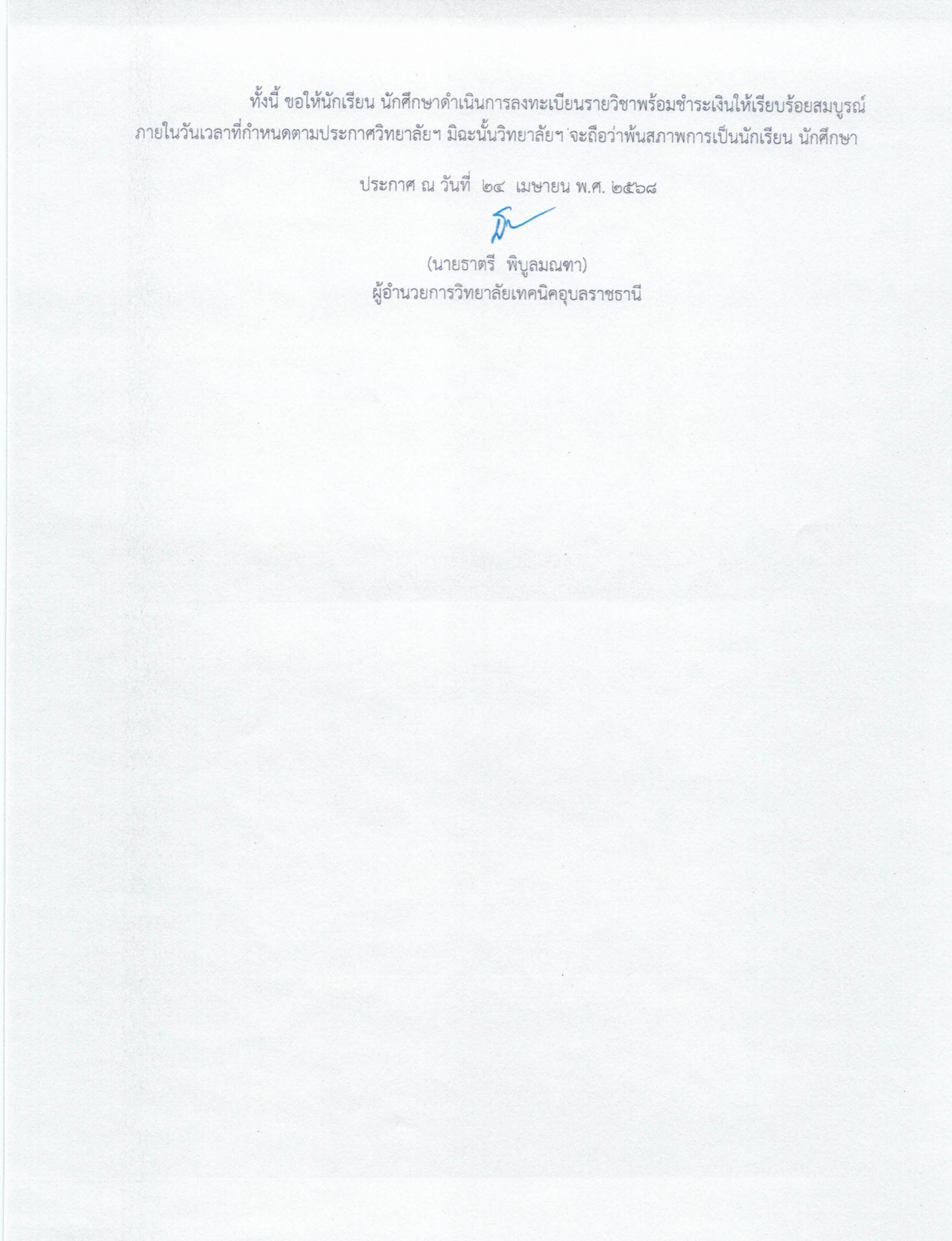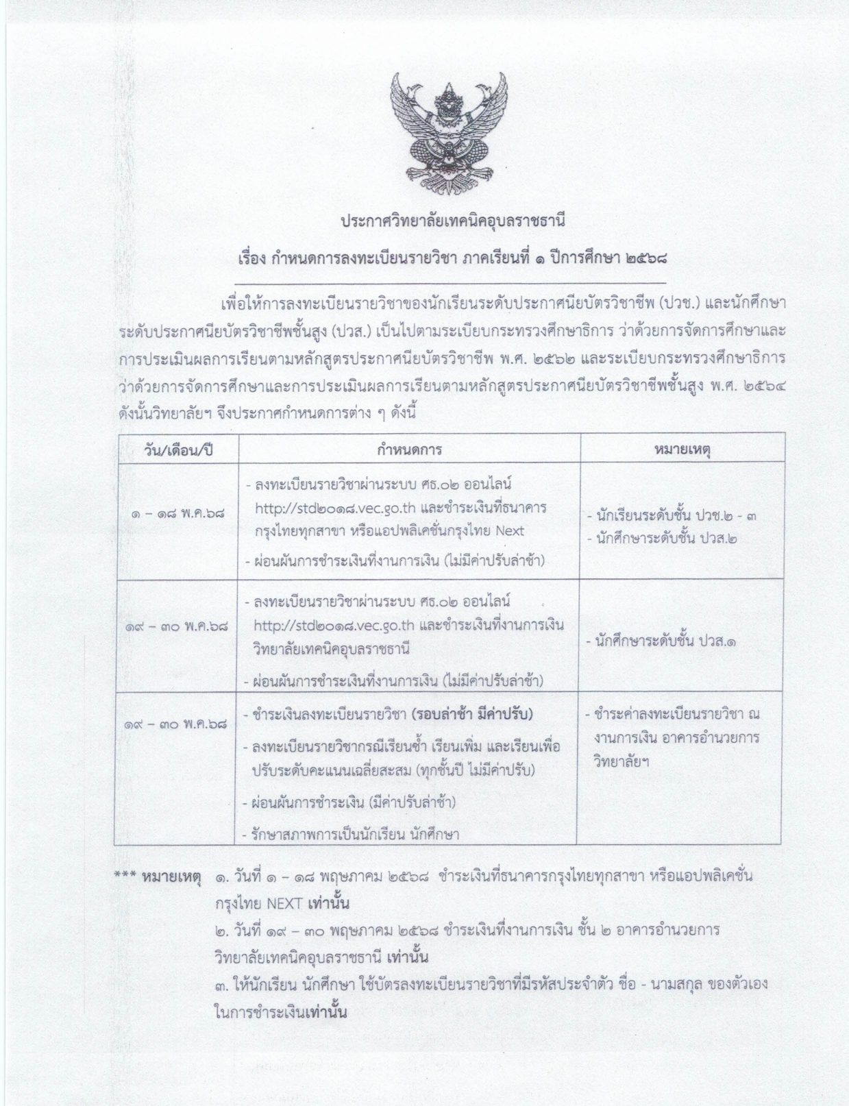 ประกาศวิทยาลัยเทคนิคอุบลราชธานี เรื่อง กำหนดการลงทะเบียนรายวิชาภาคเรียนที่ 1 ปีการศึกษา 2568
