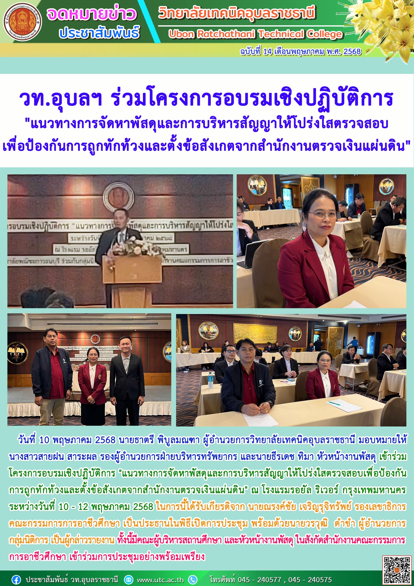 วันที่ 10 พฤษภาคม 2568 นายธาตรี พิบูลมณฑา ผู้อำนวยการวิทยาลัยเทคนิคอุบลราชธานี มอบหมายให้ นางสาวสายฝน สาระผล รองผู้อำนวยการฝ่ายบริหารทรัพยากร และนายธีรเดช ทิมา หัวหน้างานพัสดุ เข้าร่วมโครงการอบรมเชิงปฏิบัติการ “แนวทางการจัดหาพัสดุและการบริหารสัญญาให้โปร่งใสตรวจสอบเพื่อป้องกันการถูกทักท้วงและตั้งข้อสังเกตจากสำนักงานตรวจเงินแผ่นดิน” ณ โรงแรมรอยัล ริเวอร์ กรุงเทพมหานคร ระหว่างวันที่ 10 – 12 พฤษภาคม 2568 ในการนี้ได้รับเกียรติจาก นายณรงค์ชัย เจริญรุจิทรัพย์ รองเลขาธิการคณะกรรมการการอาชีวศึกษา เป็นประธานในพิธีเปิดการประชุม พร้อมด้วยนายวรวุฒิ ดำขำ ผู้อำนวยการกลุ่มนิติการ เป็นผู้กล่าวรายงาน ทั้งนี้มีคณะผู้บริหารสถานศึกษา และหัวหน้างานพัสดุ ในสังกัดสำนักงานคณะกรรมการการอาชีวศึกษา เข้าร่วมการประชุมอย่างพร้อมเพรียง