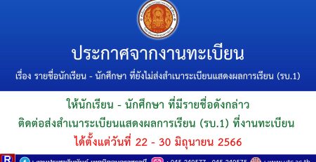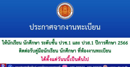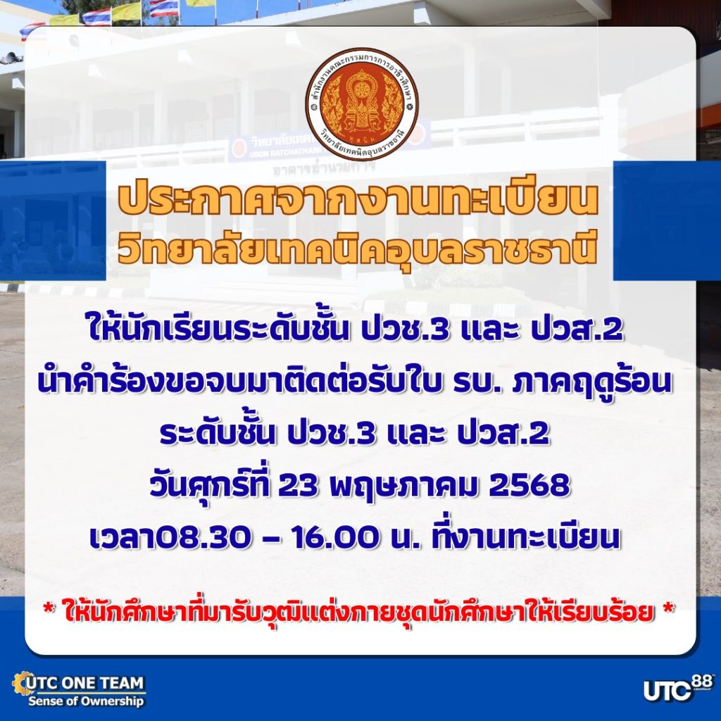 ประกาศจากงานทะเบียน ให้นักเรียนระดับชั้น ปวช.3 และ ปวส.2 นำคำร้องขอจบมาติดต่อรับใบ รบ. ภาคฤดูร้อน