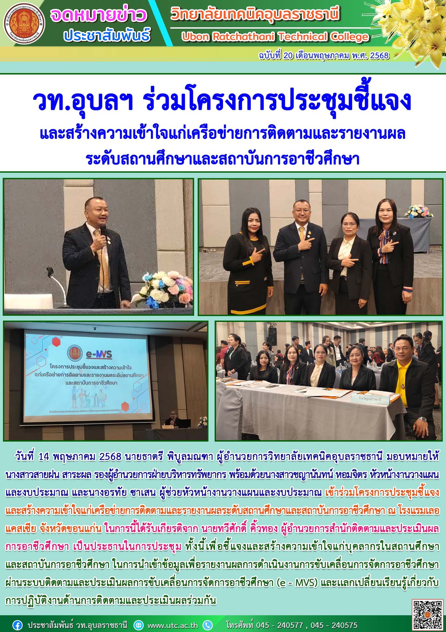 วันที่ 14 พฤษภาคม 2568 นายธาตรี พิบูลมณฑา ผู้อำนวยการวิทยาลัยเทคนิคอุบลราชธานี มอบหมายให้ นางสาวสายฝน สาระผล รองผู้อำนวยการฝ่ายบริหารทรัพยากร พร้อมด้วยนางสาวชญานันทน์ หอมจิตร หัวหน้างานวางแผนและงบประมาณ และนางอรทัย ซาเสน ผู้ช่วยหัวหน้างานวางแผนและงบประมาณ เข้าร่วมโครงการประชุมชี้แจงและสร้างความเข้าใจแก่เครือข่ายการติดตามและรายงานผลระดับสถานศึกษาและสถาบันการอาชีวศึกษา ณ โรงแรมเลอ แคสเซีย จังหวัดขอนแก่น ในการนี้ได้รับเกียรติจาก นายทวีศักดิ์ คิ้วทอง ผู้อำนวยการสำนักติดตามและประเมินผลการอาชีวศึกษา เป็นประธานในการประชุม ทั้งนี้เพื่อชี้แจงและสร้างความเข้าใจแก่บุคลากรในสถานศึกษา และสถาบันการอาชีวศึกษา ในการนำเข้าข้อมูลเพื่อรายงานผลการดำเนินงานการขับเคลื่อนการจัดการอาชีวศึกษาผ่านระบบติดตามและประเมินผลการขับเคลื่อนการจัดการอาชีวศึกษา (e – MVS) และเเลกเปลี่ยนเรียนรู้เกี่ยวกับการปฏิบัติงานด้านการติดตามและประเมินผลร่วมกัน