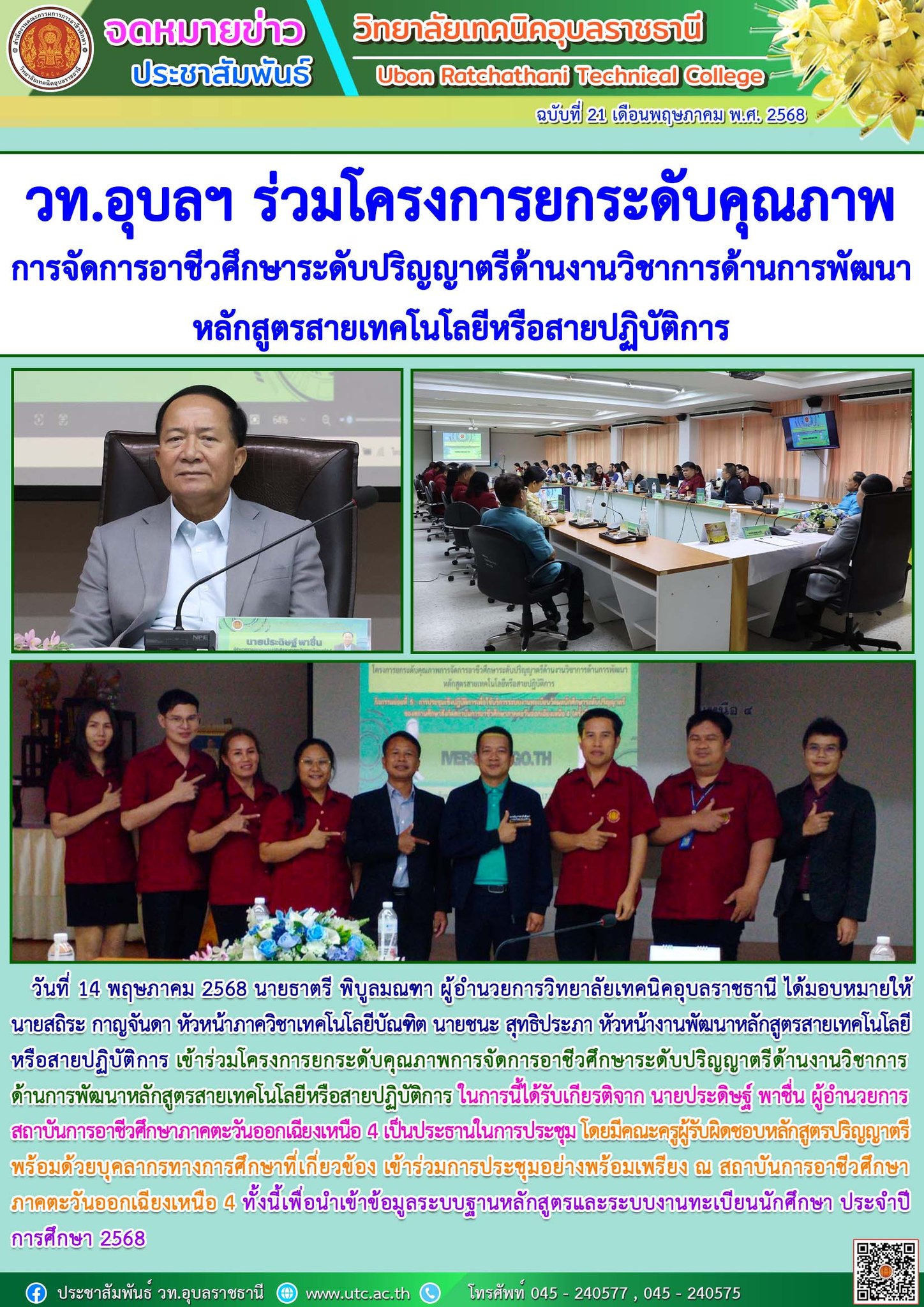 วันที่ 14 พฤษภาคม 2568 นายธาตรี พิบูลมณฑา ผู้อำนวยการวิทยาลัยเทคนิคอุบลราชธานี ได้มอบหมายให้ นายสถิระ กาญจันดา หัวหน้าภาควิชาเทคโนโลยีบัณฑิต นายชนะ สุทธิประภา หัวหน้างานพัฒนาหลักสูตรสายเทคโนโลยีหรือสายปฏิบัติการ เข้าร่วมโครงการยกระดับคุณภาพการจัดการอาชีวศึกษาระดับปริญญาตรีด้านงานวิชาการด้านการพัฒนาหลักสูตรสายเทคโนโลยีหรือสายปฏิบัติการ ในการนี้ได้รับเกียรติจาก นายประดิษฐ์ พาชื่น ผู้อำนวยการสถาบันการอาชีวศึกษาภาคตะวันออกเฉียงเหนือ 4 เป็นประธานในการประชุม โดยมีคณะครูผู้รับผิดชอบหลักสูตรปริญญาตรี พร้อมด้วยบุคลากรทางการศึกษา ที่เกี่ยวข้อง เข้าร่วมการประชุมอย่างพร้อมเพรียง ณ สถาบันการอาชีวศึกษาภาคตะวันออกเฉียงเหนือ 4 ทั้งนี้เพื่อนำเข้าข้อมูลระบบฐานหลักสูตรและระบบงานทะเบียนนักศึกษา ประจำปีการศึกษา 2568