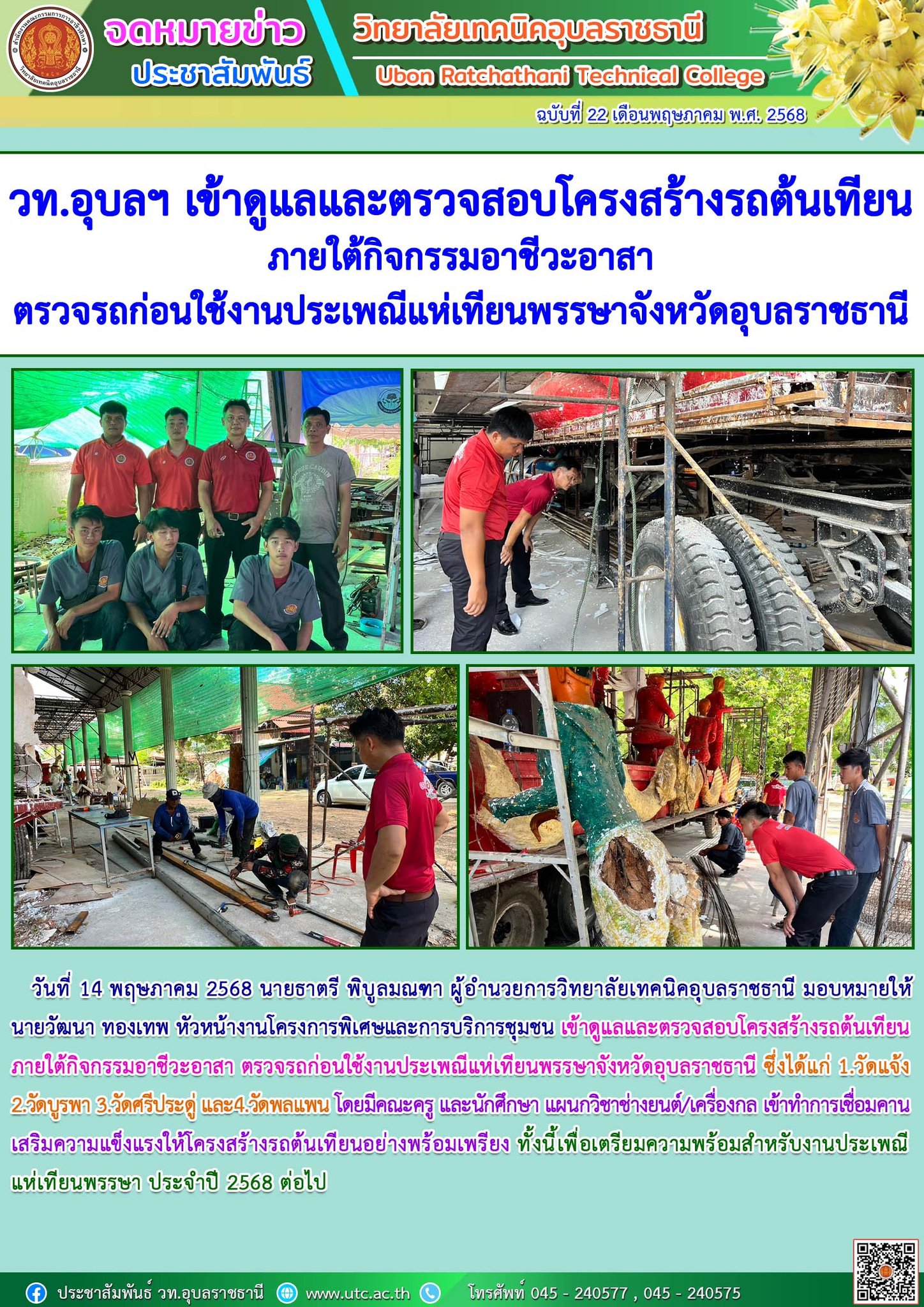 วันที่ 14 พฤษภาคม 2568 นายธาตรี พิบูลมณฑา ผู้อำนวยการวิทยาลัยเทคนิคอุบลราชธานี มอบหมายให้ นายวัฒนา ทองเทพ หัวหน้างานโครงการพิเศษและการบริการชุมชน เข้าดูแลและตรวจสอบโครงสร้างรถต้นเทียน ภายใต้กิจกรรมอาชีวะอาสา ตรวจรถก่อนใช้งานประเพณีแห่เทียนพรรษาจังหวัดอุบลราชธานี ซึ่งได้แก่ 1.วัดแจ้ง 2.วัดบูรพา 3.วัดศรีประดู่ และ4.วัดพลแพน โดยมีคณะครู และนักศึกษา แผนกวิชาช่างยนต์/เครื่องกล เข้าทำการเชื่อมคานเสริมความแข็งแรงให้โครงสร้างรถต้นเทียนอย่างพร้อมเพรียง ทั้งนี้เพื่อเตรียมความพร้อมสำหรับงานประเพณีแห่เทียนพรรษา ประจำปี 2568 ต่อไป