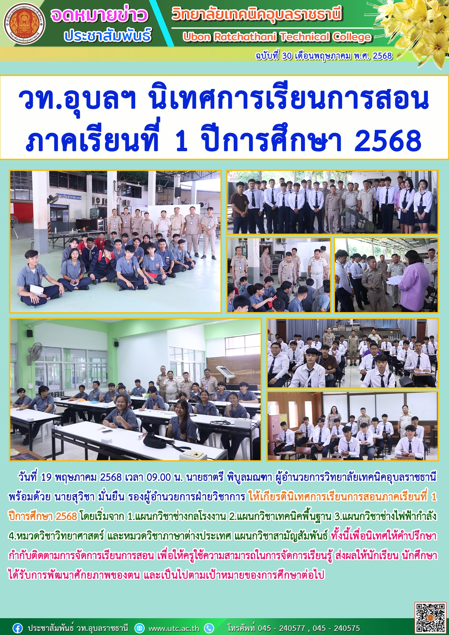 วันที่ 19 พฤษภาคม 2568 เวลา 09.00 น. นายธาตรี พิบูลมณฑา ผู้อำนวยการวิทยาลัยเทคนิคอุบลราชธานี พร้อมด้วย นายสุวิชา มั่นยืน รองผู้อำนวยการฝ่ายวิชาการ ให้เกียรตินิเทศการเรียนการสอนภาคเรียนที่ 1 ปีการศึกษา 2568 โดยเริ่มจาก 1.แผนกวิชาช่างกลโรงงาน 2.แผนกวิชาเทคนิคพื้นฐาน 3.แผนกวิชาช่างไฟฟ้ากำลัง 4.หมวดวิชาวิทยาศาสตร์ และหมวดวิชาภาษาต่างประเทศ แผนกวิชาสามัญสัมพันธ์ ทั้งนี้เพื่อนิเทศให้คำปรึกษา กำกับติดตามการจัดการเรียนการสอน เพื่อให้ครูใช้ความสามารถในการจัดการเรียนรู้ ส่งผลให้นักเรียน นักศึกษา ได้รับการพัฒนาศักยภาพของตน และเป็นไปตามเป้าหมายของการศึกษาต่อไป