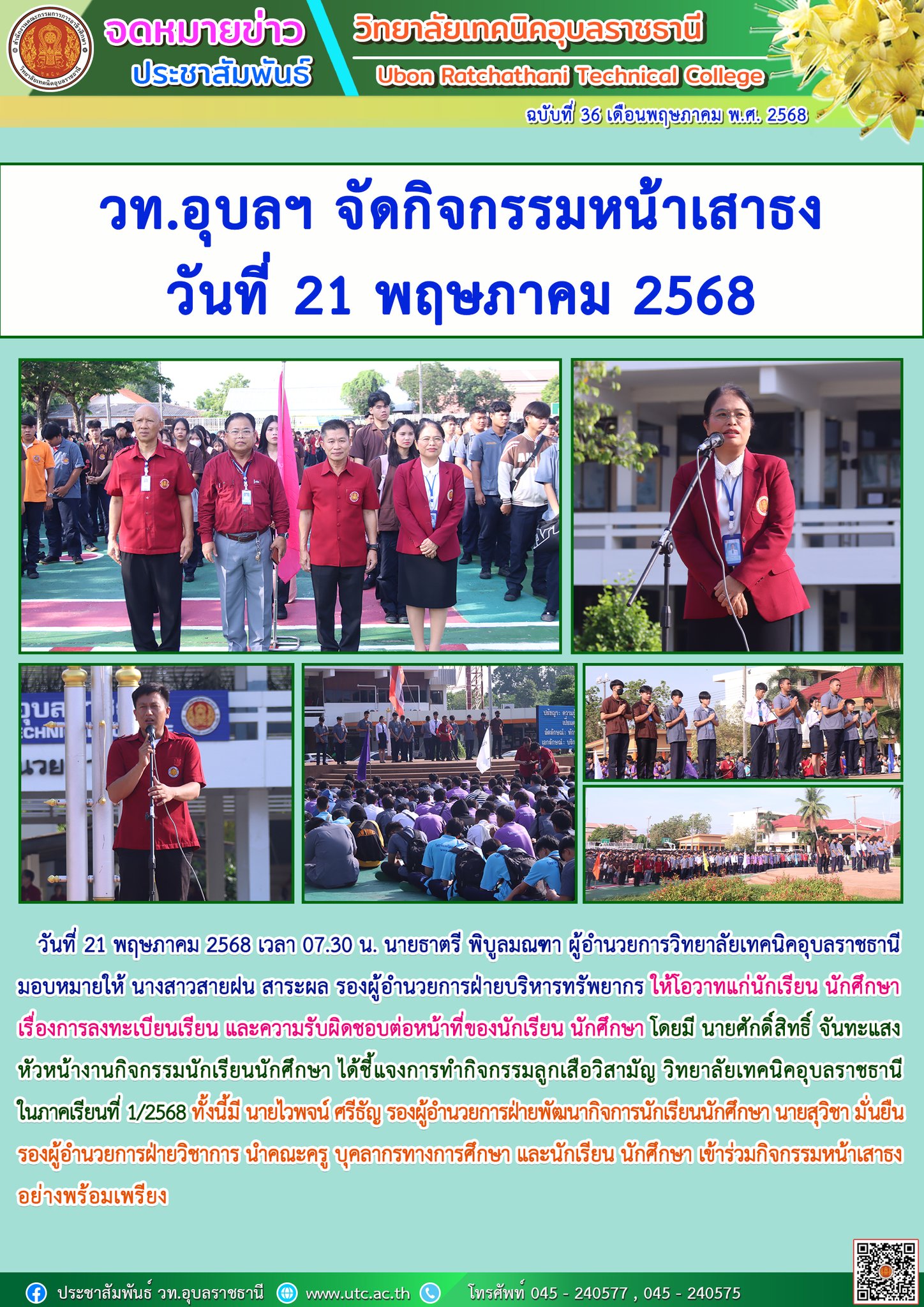 วันที่ 21 พฤษภาคม 2568 เวลา 07.30 น. นายธาตรี พิบูลมณฑา ผู้อำนวยการวิทยาลัยเทคนิคอุบลราชธานี มอบหมายให้ นางสาวสายฝน สาระผล รองผู้อำนวยการฝ่ายบริหารทรัพยากร ให้โอวาทแก่นักเรียน นักศึกษา เรื่องการลงทะเบียนเรียน และความรับผิดชอบต่อหน้าที่ของนักเรียน นักศึกษา โดยมี นายศักดิ์สิทธิ์ จันทะแสง หัวหน้างานกิจกรรมนักเรียนนักศึกษา ได้ชี้แจงการทำกิจกรรมลูกเสือวิสามัญ วิทยาลัยเทคนิคอุบลราชธานี ในภาคเรียน 1/2568 ทั้งนี้มี นายไวพจน์ ศรีธัญ รองผู้อำนวยการฝ่ายพัฒนากิจการนักเรียนนักศึกษา นายสุวิชา มั่นยืน รองผู้อำนวยการฝ่ายวิชาการ นำคณะครู บุคลากรทางการศึกษา และนักเรียน นักศึกษา เข้าร่วมกิจกรรมหน้าเสาธงอย่างพร้อมเพรียง