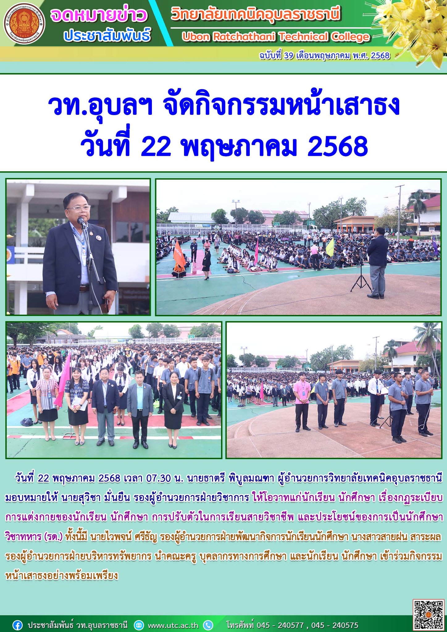วันที่ 22 พฤษภาคม 2568 เวลา 07.30 น. นายธาตรี พิบูลมณฑา ผู้อำนวยการวิทยาลัยเทคนิคอุบลราชธานี มอบหมายให้ นายสุวิชา มั่นยืน รองผู้อำนวยการฝ่ายวิชาการ ให้โอวาทแก่นักเรียน นักศึกษา เรื่องกฏระเบียบการแต่งกายของนักเรียน นักศึกษา การปรับตัวในการเรียนสายวิชาชีพ และประโยชน์ของการเป็นนักศึกษาวิชาทหาร (รด.) ทั้งนี้มี นายไวพจน์ ศรีธัญ รองผู้อำนวยการฝ่ายพัฒนากิจการนักเรียนนักศึกษา นางสาวสายฝน สาระผล รองผู้อำนวยการฝ่ายบริหารทรัพยากร นำคณะครู บุคลากรทางการศึกษา และนักเรียน นักศึกษา เข้าร่วมกิจกรรมหน้าเสาธงอย่างพร้อมเพรียง