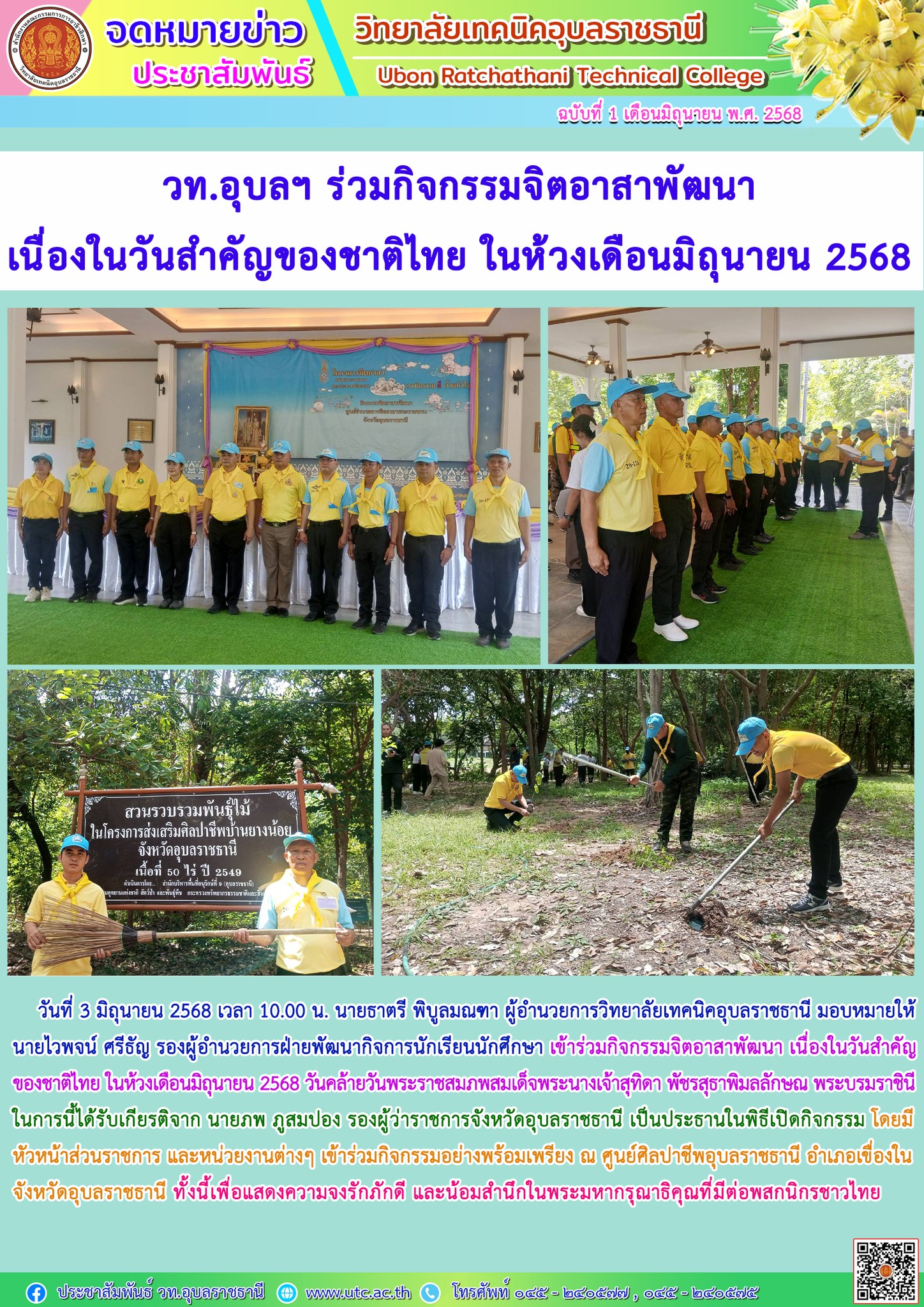 วันที่ 3 มิถุนายน 2568 เวลา 10.00 น. นายธาตรี พิบูลมณฑา ผู้อำนวยการวิทยาลัยเทคนิคอุบลราชธานี มอบหมายให้ นายไวพจน์ ศรีธัญ รองผู้อำนวยการฝ่ายพัฒนากิจการนักเรียนนักศึกษา เข้าร่วมกิจกรรมจิตอาสาพัฒนา เนื่องในวันสำคัญของชาติไทย ในห้วงเดือนมิถุนายน 2568 วันคล้ายวันพระราชสมภพสมเด็จพระนางเจ้าสุทิดา พัชรสุธาพิมลลักษณ พระบรมราชินี ในการนี้ได้รับเกียรติจาก นายภพ ภูสมปอง รองผู้ว่าราชการจังหวัดอุบลราชธานี เป็นประธานในพิธีเปิดกิจกรรม โดยมีหัวหน้าส่วนราชการ และหน่วยงานต่างๆ เข้าร่วมกิจกรรมอย่างพร้อมเพรียง ณ ศูนย์ศิลปาชีพอุบลราชธานี อำเภอเขื่องใน จังหวัดอุบลราชธานี ทั้งนี้เพื่อแสดงความจงรักภักดี และน้อมสำนึกในพระมหากรุณาธิคุณที่มีต่อพสกนิกรชาวไทย