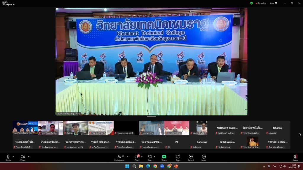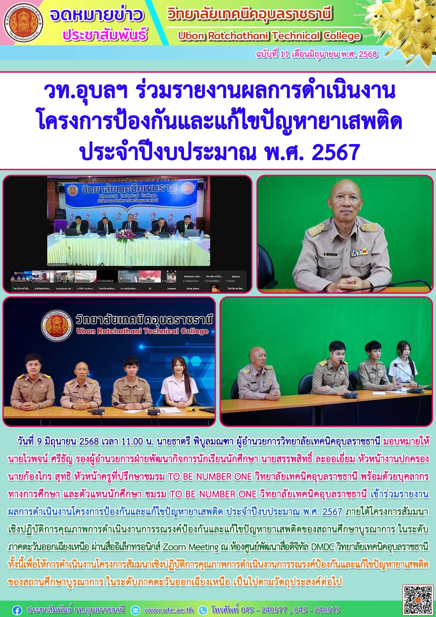 วันที่ 9 มิถุนายน 2568 เวลา 11.00 น. นายธาตรี พิบูลมณฑา ผู้อำนวยการวิทยาลัยเทคนิคอุบลราชธานี มอบหมายให้ นายไวพจน์ ศรีธัญ รองผู้อำนวยการฝ่ายพัฒนากิจการนักเรียนนักศึกษา นายสรรพสิทธิ์ ละออเอี่ยม หัวหน้างานปกครอง นายก้องไกร สุทธิ หัวหน้าครูที่ปรึกษาชมรม TO BE NUMBER ONE วิทยาลัยเทคนิคอุบลราชธานี พร้อมด้วยบุคลากรทางการศึกษา และตัวแทนนักศึกษา ชมรม TO BE NUMBER ONE วิทยาลัยเทคนิคอุบลราชธานี เข้าร่วมรายงานผลการดำเนินงานโครงการป้องกันและแก้ไขปัญหายาเสพติด ประจำปีงบประมาณ พ.ศ. 2567 ภายใต้โครงการสัมมนาเชิงปฏิบัติการคุณภาพการดำเนินงานการรณรงค์ป้องกันและแก้ไขปัญหายาเสพติดของสถานศึกษาบูรณาการ ในระดับภาคตะวันออกเฉียงเหนือ ผ่านสื่ออิเล็กทรอนิกส์ Zoom Meeting ณ ห้องศูนย์พัฒนาสื่อดิจิทัล DMDC วิทยาลัยเทคนิคอุบลราชธานี ทั้งนี้เพื่อให้การดำเนินงานโครงการสัมมนาเชิงปฏิบัติการคุณภาพการดำเนินงานการรณรงค์ป้องกันและแก้ไขปัญหายาเสพติดของสถานศึกษาบูรณาการ ในระดับภาคตะวันออกเฉียงเหนือ เป็นไปตามวัตถุประสงค์ต่อไป