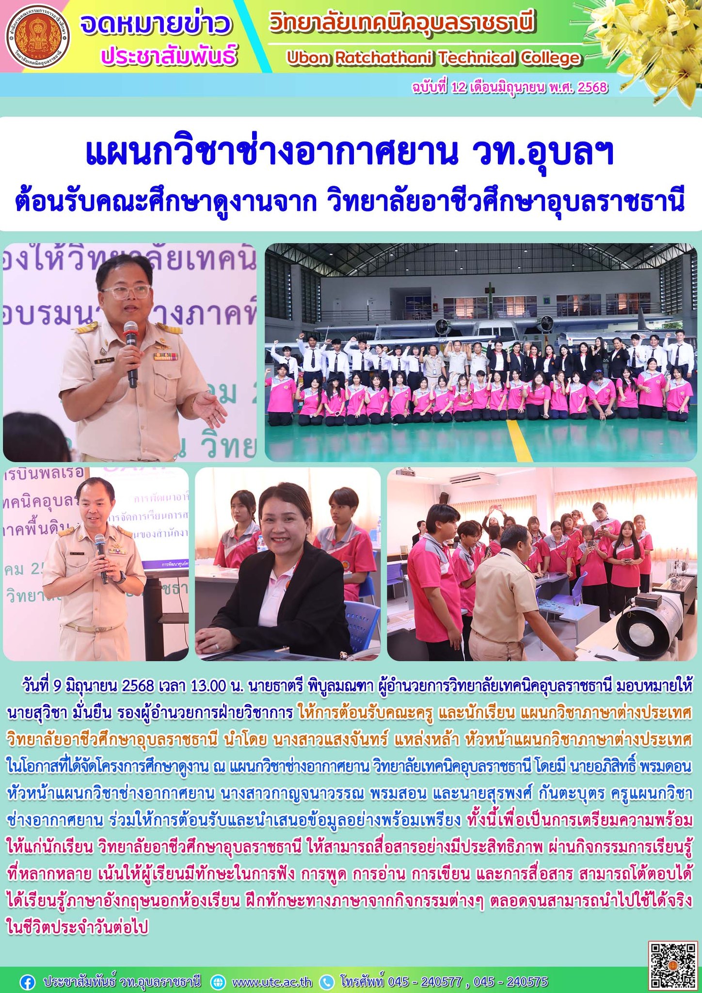 วันที่ 9 มิถุนายน 2568 เวลา 13.00 น. นายธาตรี พิบูลมณฑา ผู้อำนวยการวิทยาลัยเทคนิคอุบลราชธานี มอบหมายให้ นายสุวิชา มั่นยืน รองผู้อำนวยการฝ่ายวิชาการ ให้การต้อนรับคณะครู และนักเรียน แผนกวิชาภาษาต่างประเทศ วิทยาลัยอาชีวศึกษาอุบล ราชธานี นำโดย นางสาวแสงจันทร์ แหล่งหล้า หัวหน้าแผนกวิชาภาษาต่างประเทศ ในโอกาสที่ได้จัดโครงการศึกษาดูงาน ณ แผนกวิชาช่างอากาศยาน วิทยาลัยเทคนิคอุบลราชธานี โดยมี นายอภิสิทธิ์ พรมดอน หัวหน้าแผนกวิชาช่างอากาศยาน นางสาวกาญจนาวรรณ พรมสอน และนายสุรพงศ์ กันตะบุตร ครูแผนกวิชาช่างอากาศยาน ร่วมให้การต้อนรับและนำเสนอข้อมูลอย่างพร้อมเพรียง ทั้งนี้เพื่อเป็นการเตรียมความพร้อมให้แก่นักเรียน วิทยาลัยอาชีวศึกษาอุบลราชธานี ให้สามารถสื่อสารอย่างมีประสิทธิภาพ ผ่านกิจกรรมการเรียนรู้ที่หลากหลาย เน้นให้ผู้เรียนมีทักษะในการฟัง การพูด การอ่าน การเขียน และการสื่อสาร สามารถโต้ตอบได้ ได้เรียนรู้ภาษาอังกฤษนอกห้องเรียน ฝึกทักษะทางภาษาจากกิจกรรมต่างๆ ตลอดจนสามารถนำไปใช้ได้จริงในชีวิตประจำวันต่อไป