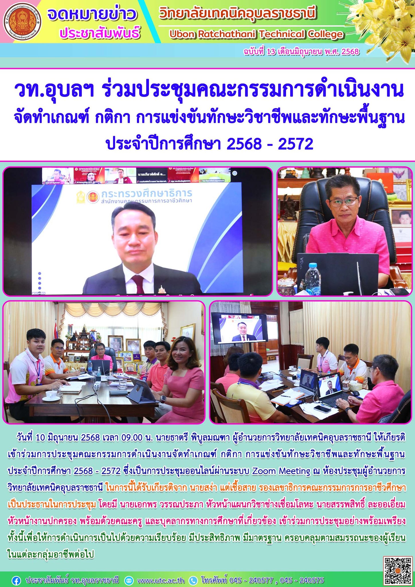 วันที่ 10 มิถุนายน 2568 เวลา 09.00 น. นายธาตรี พิบูลมณฑา ผู้อำนวยการวิทยาลัยเทคนิคอุบลราชธานี ให้เกียรติเข้าร่วมการประชุมคณะกรรมการดำเนินงานจัดทำเกณฑ์ กติกา การแข่งขันทักษะวิชาชีพและทักษะพื้นฐาน ประจำปีการศึกษา 2568 – 2572 ซึ่งเป็นการประชุมออนไลน์ผ่านระบบ Zoom Meeting ณ ห้องประชุมผู้อำนวยการวิทยาลัยเทคนิคอุบลราชธานี ในการนี้ได้รับเกียรติจาก นายสง่า แต่เชื้อสาย รองเลขาธิการคณะกรรมการการอาชีวศึกษา เป็นประธานในการประชุม โดยมี นายเอกพร วรรณประภา หัวหน้าแผนกวิชาช่างเชื่อมโลหะ นายสรรพสิทธิ์ ละออเอี่ยม หัวหน้างานปกครอง พร้อมด้วยคณะครู และบุคลากรทางการศึกษาที่เกี่ยวข้อง เข้าร่วมการประชุมอย่างพร้อมเพรียง ทั้งนี้เพื่อให้การดำเนินการเป็นไปด้วยความเรียบร้อย มีประสิทธิภาพ มีมาตรฐาน ครอบคลุมตามสมรรถนะของผู้เรียนในแต่ละกลุ่มอาชีพต่อไป