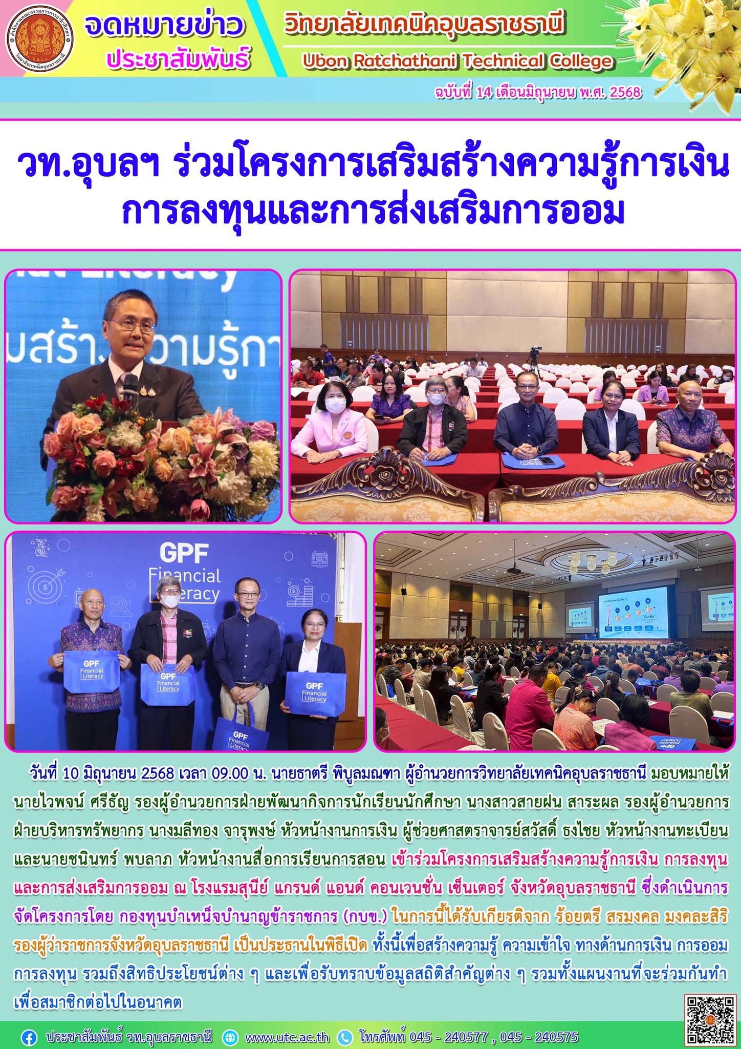 วันที่ 10 มิถุนายน 2568 เวลา 09.00 น. นายธาตรี พิบูลมณฑา ผู้อำนวยการวิทยาลัยเทคนิคอุบลราชธานี มอบหมายให้ นายไวพจน์ ศรีธัญ รองผู้อำนวยการฝ่ายพัฒนากิจการนักเรียนนักศึกษา นางสาวสายฝน สาระผล รองผู้อำนวยการฝ่ายบริหาร ทรัพยากร นางมลีทอง จารุพงษ์ หัวหน้างานการเงิน ผู้ช่วยศาสตราจารย์สวัสดิ์ ธงไชย หัวหน้างานทะเบียน และนายชนินทร์ พบลาภ หัวหน้างานสื่อการเรียนการสอน เข้าร่วมโครงการเสริมสร้างความรู้การเงิน การลงทุนและการส่งเสริมการออม ณ โรงแรมสุนีย์ แกรนด์ แอนด์ คอนเวนชั่น เซ็นเตอร์ จังหวัดอุบลราชธานี ซึ่งดำเนินการจัดโครงการโดย กองทุนบำเหน็จบำนาญข้าราชการ (กบข.) ในการนี้ได้รับเกียรติจาก ร้อยตรี สรมงคล มงคละสิริ รองผู้ว่าราชการจังหวัดอุบลราชธานี เป็นประธานในพิธีเปิด ทั้งนี้เพื่อสร้างความรู้ ความเข้าใจ ทางด้านการเงิน การออม การลงทุน รวมถึงสิทธิประโยชน์ต่าง ๆ และเพื่อรับทราบข้อมูลสถิติสำคัญต่าง ๆ รวมทั้งแผนงานที่จะร่วมกันทำเพื่อสมาชิกต่อไปในอนาคต