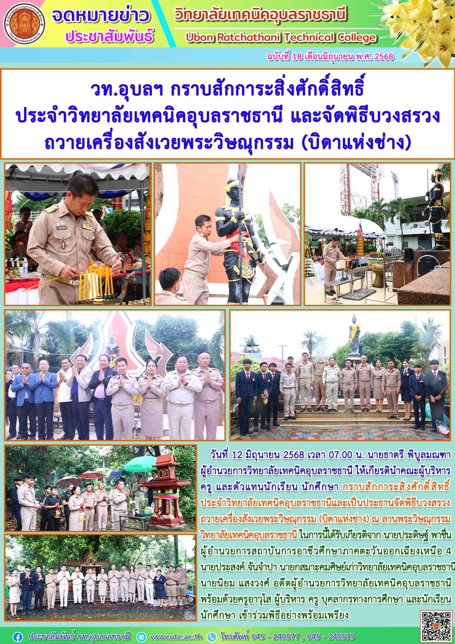 วันที่ 12 มิถุนายน 2568 เวลา 07.00 น. นายธาตรี พิบูลมณฑา ผู้อำนวยการวิทยาลัยเทคนิคอุบลราชธานี ให้เกียรตินำคณะผู้บริหาร ครู และตัวแทนนักเรียน นักศึกษา กราบสักการะสิ่งศักดิ์สิทธิ์ประจำวิทยาลัยเทคนิคอุบลราชธานีและเป็นประธานจัดพิธีบวงสรวง ถวายเครื่องสังเวยพระวิษณุกรรม (บิดาแห่งช่าง) ณ ลานพระวิษณุกรรม วิทยาลัยเทคนิคอุบลราชธานี ในการนี้ได้รับเกียรติจาก นายประดิษฐ์ พาชื่น ผู้อำนวยการสถาบันการอาชีวศึกษาภาคตะวันออกเฉียงเหนือ 4 นายประสงค์ จันจำปา นายกสมาคมศิษย์เก่าวิทยาลัยเทคนิคอุบลราชธานี นายนิยม แสงวงศ์ อดีตผู้อำนวยการวิทยาลัยเทคนิคอุบลราชธานี พร้อมด้วยครูอาวุโส ผู้บริหาร ครู บุคลากรทางการศึกษา และนักเรียน นักศึกษา เข้าร่วมพิธีอย่างพร้อมเพรียง