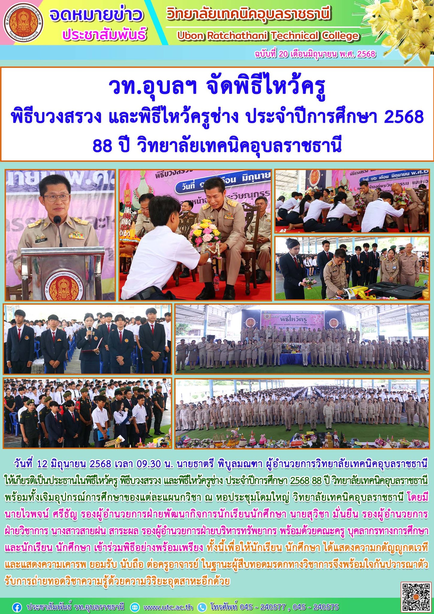 วันที่ 12 มิถุนายน 2568 เวลา 09.30 น. นายธาตรี พิบูลมณฑา ผู้อำนวยการวิทยาลัยเทคนิคอุบลราชธานี ให้เกียรติเป็นประธานในพิธีไหว้ครู พิธีบวงสรวง และพิธีไหว้ครูช่าง ประจำปีการศึกษา 2568 88 ปี วิทยาลัย เทคนิคอุบลราชธานี พร้อมทั้งเจิมอุปกรณ์การศึกษาของแต่ละแผนกวิชา ณ หอประชุมโดมใหญ่ วิทยาลัยเทคนิคอุบลราชธานี โดยมี นายไวพจน์ ศรีธัญ รองผู้อำนวยการฝ่ายพัฒนากิจการนักเรียนนักศึกษา นายสุวิชา มั่นยืน รองผู้อำนวยการฝ่ายวิชาการ นางสาวสายฝน สาระผล รองผู้อำนวยการฝ่ายบริหารทรัพยากร พร้อมด้วยคณะครู บุคลากรทางการศึกษา และนักเรียน นักศึกษา เข้าร่วมพิธีอย่างพร้อมเพรียง ทั้งนี้เพื่อให้นักเรียน นักศึกษา ได้แสดงความกตัญญูกตเวที และแสดงความเคารพ ยอมรับ นับถือ ต่อครูอาจารย์ ในฐานะผู้สืบทอดมรดกทางวิชาการจึงพร้อมใจกันปวารณาตัวรับการถ่ายทอดวิชาความรู้ด้วยความวิริยะอุตสาหะอีกด้วย