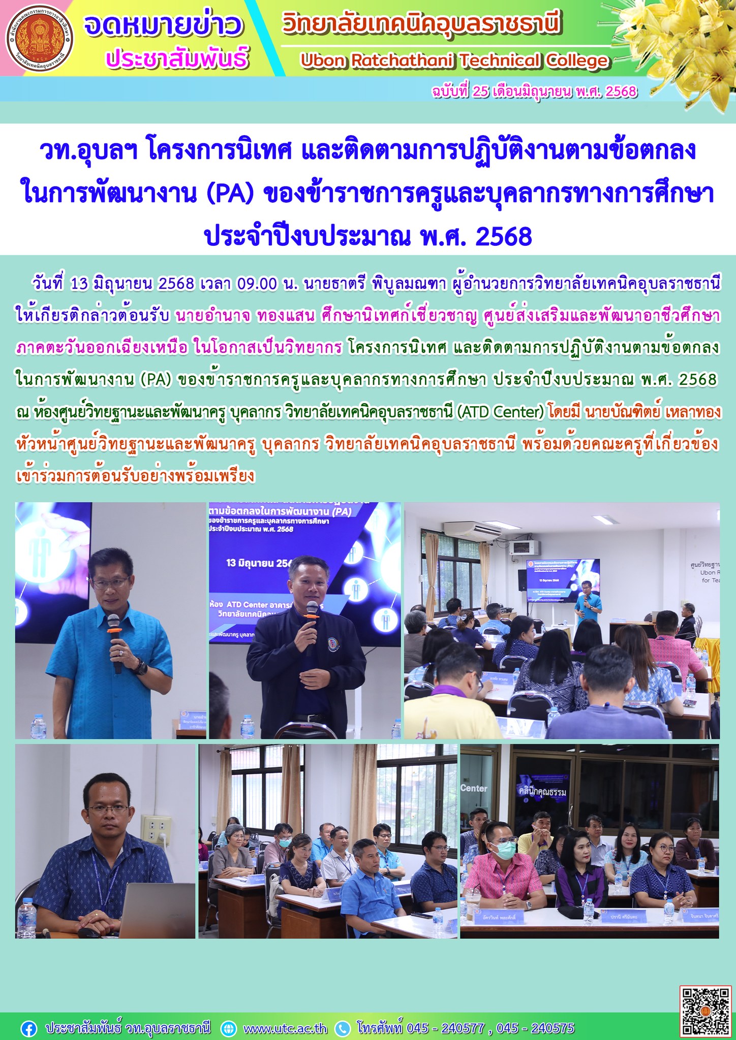 วันที่ 13 มิถุนายน 2568 เวลา 09.00 น. นายธาตรี พิบูลมณฑา ผู้อำนวยการวิทยาลัยเทคนิคอุบลราชธานี ให้เกียรติกล่าวต้อนรับ นายอำนาจ ทองแสน ศึกษานิเทศก์เชี่ยวชาญ ศูนย์ส่งเสริมและพัฒนาอาชีวศึกษาภาคตะวันออกเฉียงเหนือ ในโอกาสเป็นวิทยากร โครงการนิเทศ และติดตามการปฏิบัติงานตามข้อตกลงในการพัฒนางาน (PA) ของข้าราชการครูและบุคลากรทางการศึกษา ประจำปีงบประมาณ พ.ศ. 2568 ณ ห้องศูนย์วิทยฐานะและพัฒนาครู บุคลากร วิทยาลัยเทคนิคอุบลราชธานี (ATD Center) โดยมี นายบัณฑิตย์ เหลาทอง หัวหน้าศูนย์วิทยฐานะและพัฒนาครู บุคลากร วิทยาลัยเทคนิคอุบลราชธานี พร้อมด้วยคณะครูที่เกี่ยวข้อง เข้าร่วมการต้อนรับอย่างพร้อมเพรียง