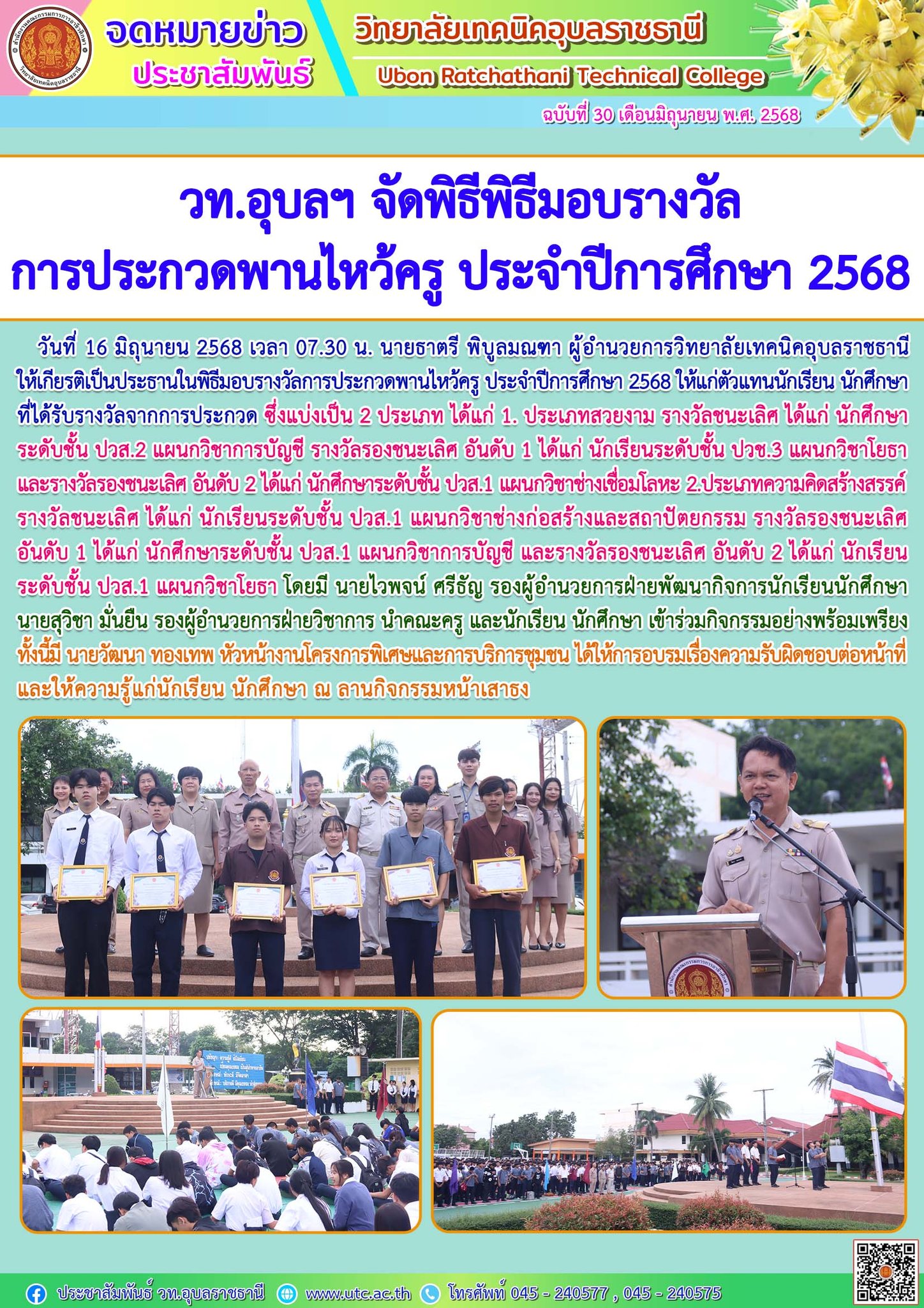วันที่ 16 มิถุนายน 2568 เวลา 07.30 น. นายธาตรี พิบูลมณฑา ผู้อำนวยการวิทยาลัยเทคนิคอุบลราชธานี ให้เกียรติเป็นประธานในพิธีมอบรางวัลการประกวดพานไหว้ครู ประจำปีการศึกษา 2568 ให้แก่ตัวแทนนักเรียน นักศึกษา ที่ได้รับรางวัลจากการประกวด ซึ่งแบ่งเป็น 2 ประเภท ได้แก่ 1. ประเภทสวยงาม รางวัลชนะเลิศ ได้แก่ นักศึกษาระดับชั้น ปวส.2 แผนกวิชาการบัญชี รางวัลรองชนะเลิศ อันดับ 1 ได้แก่ นักเรียนระดับชั้น ปวช.3 แผนกวิชาโยธา และรางวัลรองชนะเลิศ อันดับ 2 ได้แก่ นักศึกษาระดับชั้น ปวส.1 แผนกวิชาช่างเชื่อมโลหะ 2.ประเภทความคิดสร้างสรรค์ รางวัลชนะเลิศ ได้แก่ นักเรียนระดับชั้น ปวส.1 แผนกวิชาช่างก่อสร้างและสถาปัตยกรรม รางวัลรองชนะเลิศ อันดับ 1 ได้แก่ นักศึกษาระดับชั้น ปวส.1 แผนกวิชาการบัญชี และรางวัลรองชนะเลิศ อันดับ 2 ได้แก่ นักเรียนระดับชั้น ปวส.1 แผนกวิชาโยธา โดยมี นายไวพจน์ ศรีธัญ รองผู้อำนวยการฝ่ายพัฒนากิจการนักเรียนนักศึกษา นายสุวิชา มั่นยืน รองผู้อำนวยการฝ่ายวิชาการ นำคณะครู และนักเรียน นักศึกษา เข้าร่วมกิจกรรมอย่างพร้อมเพรียง ทั้งนี้มี นายวัฒนา ทองเทพ หัวหน้างานโครงการพิเศษและการบริการชุมชน ได้ให้การอบรมคุณธรรม จริยธรรม และให้ความรู้แก่นักเรียน นักศึกษา ณ ลานกิจกรรมหน้าเสาธง
