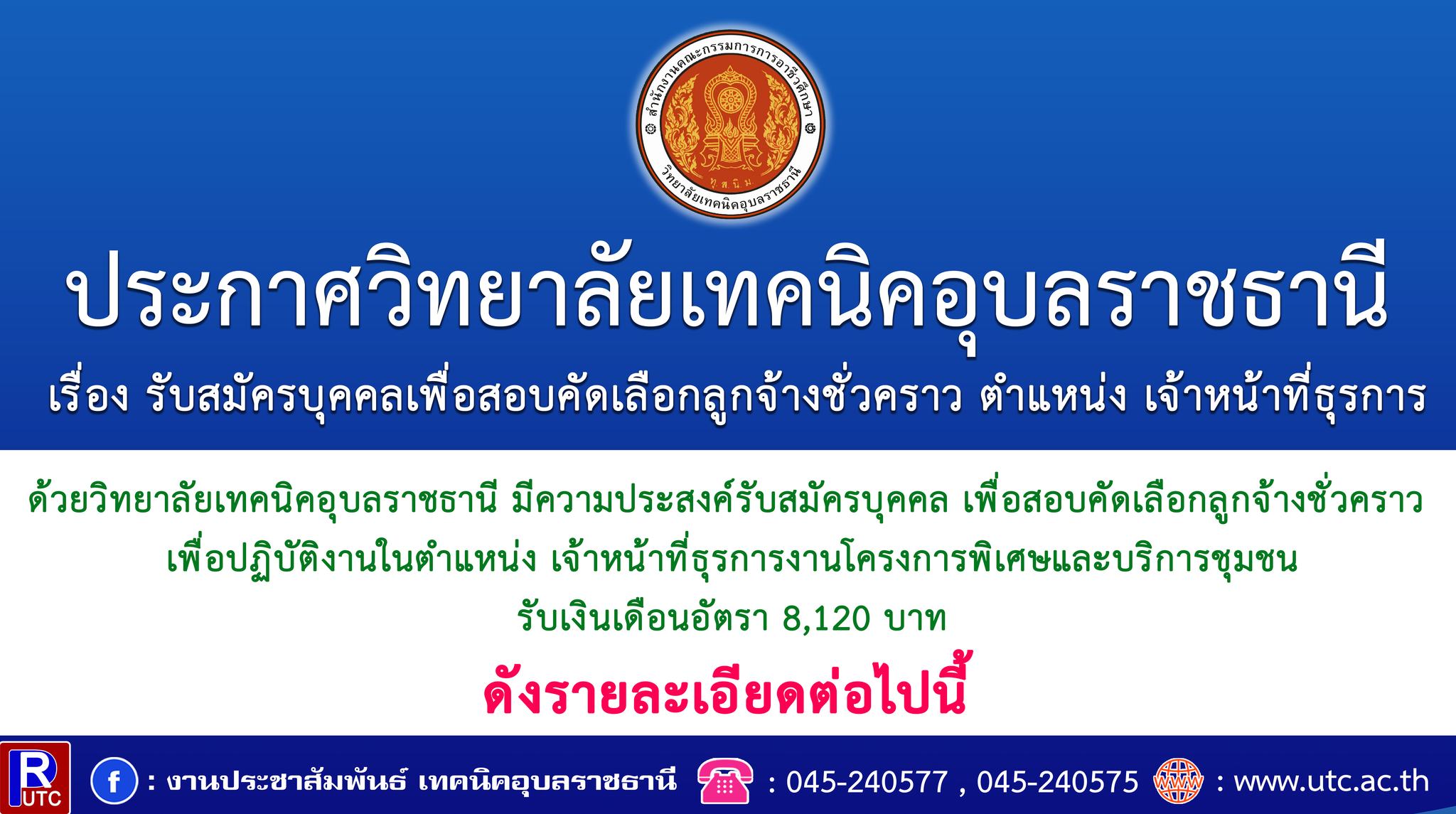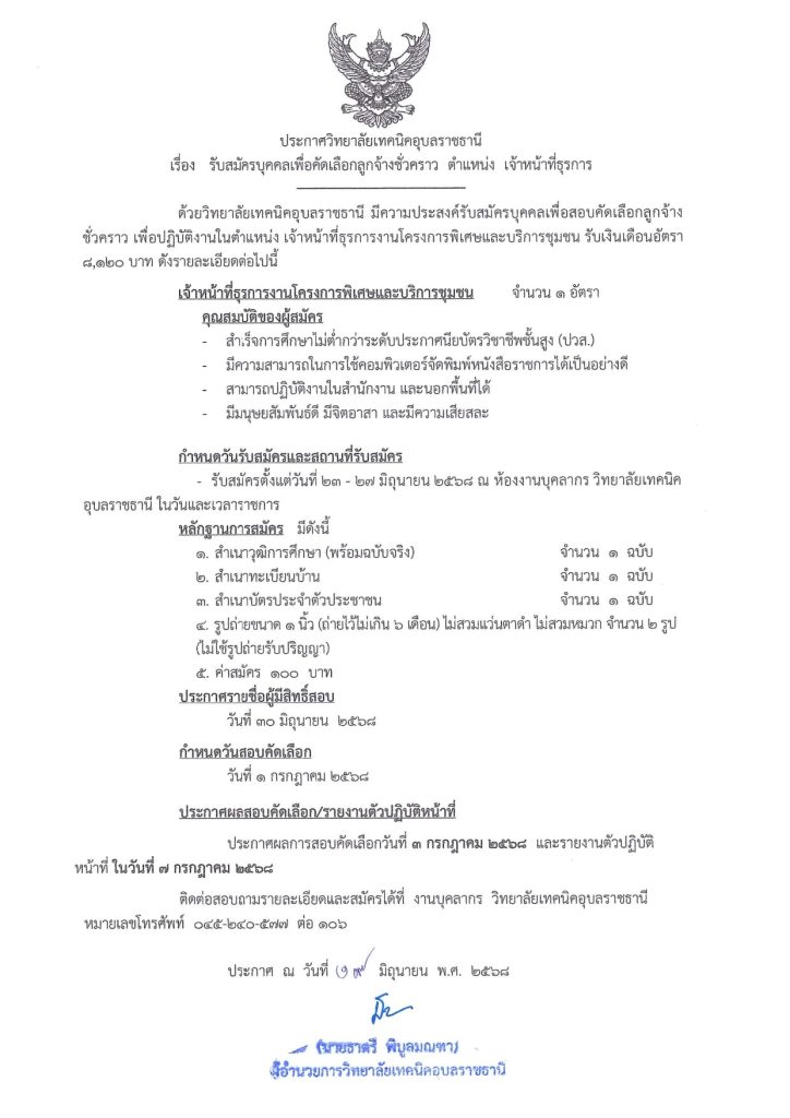 ด้วยวิทยาลัยเทคนิคอุบลราชธานี มีความประสงค์รับสมัครบุคคล เพื่อสอบคัดเลือกลูกจ้างชั่วคราว เพื่อปฏิบัติงานในตำแหน่ง เจ้าหน้าที่ธุรการงานโครงการพิเศษและบริการชุมชน รับเงินเดือนอัตรา 8,120 บาท