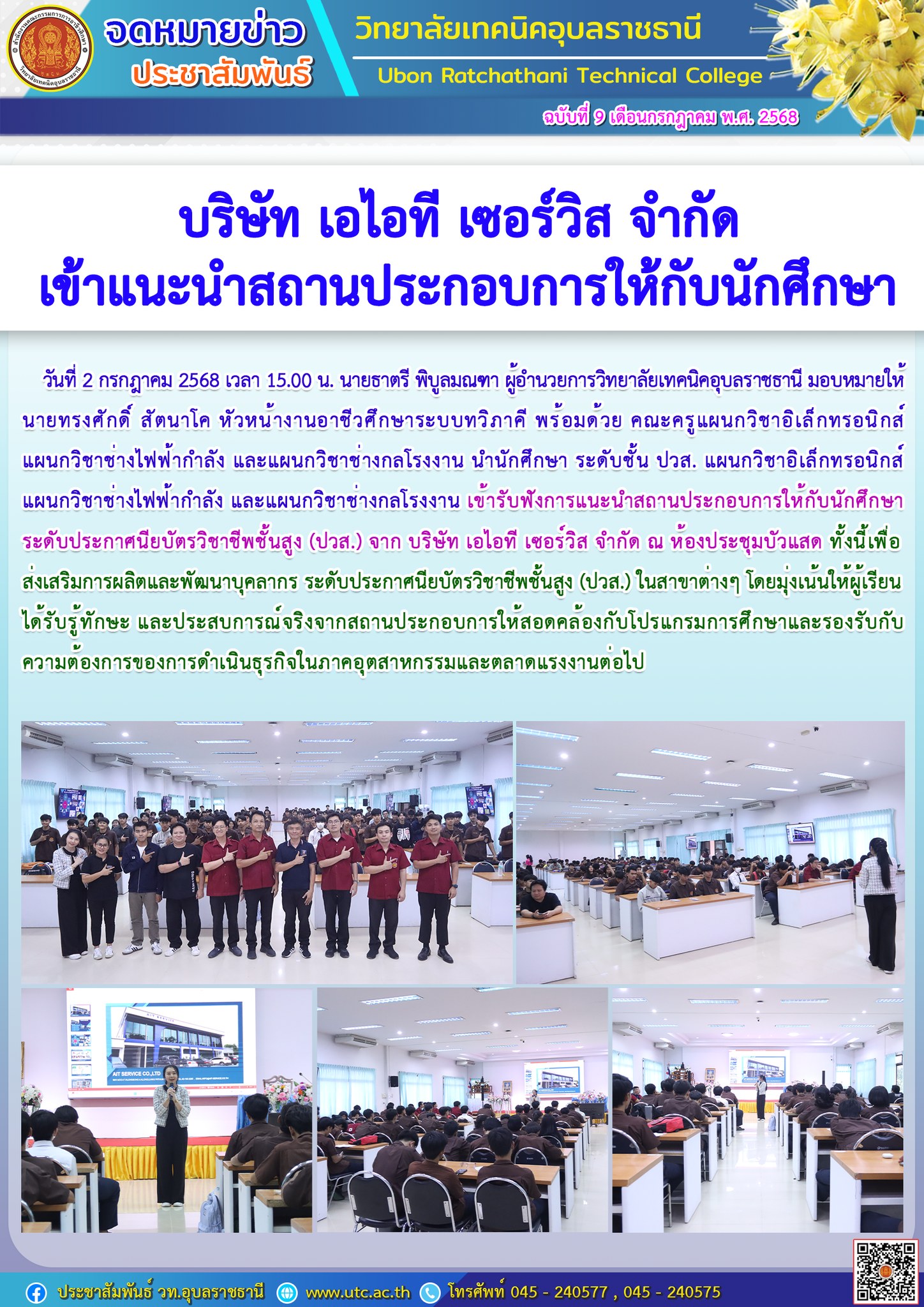 วันที่ 2 กรกฎาคม 2568 เวลา 15.00 น. นายธาตรี พิบูลมณฑา ผู้อำนวยการวิทยาลัยเทคนิคอุบลราชธานี มอบหมายให้ นายทรงศักดิ์ สัตนาโค หัวหน้างานอาชีวศึกษาระบบทวิภาคี พร้อมด้วย คณะครูแผนกวิชาอิเล็กทรอนิกส์ แผนกวิชาช่างไฟฟ้ากำลัง และแผนกวิชาช่างกลโรงงาน นำนักศึกษา ระดับชั้น ปวส. แผนกวิชาอิเล็กทรอนิกส์ แผนกวิชาช่างไฟฟ้ากำลัง และแผนกวิชาช่างกลโรงงาน เข้ารับฟังการแนะนำสถานประกอบการให้กับนักศึกษาระดับประกาศนียบัตรวิชาชีพชั้นสูง (ปวส.) จาก บริษัท เอไอที เซอร์วิส จำกัด ณ ห้องประชุมบัวแสด ทั้งนี้เพื่อส่งเสริมการผลิตและพัฒนาบุคลากร ระดับประกาศนียบัตรวิชาชีพชั้นสูง (ปวส.) ในสาขาต่างๆ โดยมุ่งเน้นให้ผู้เรียนได้รับรู้ทักษะ และประสบการณ์จริงจากสถานประกอบการให้สอดคล้องกับโปรแกรมการศึกษาและรองรับกับความต้องการของการดำเนินธุรกิจในภาคอุตสาหกรรมและตลาดแรงงานต่อไป