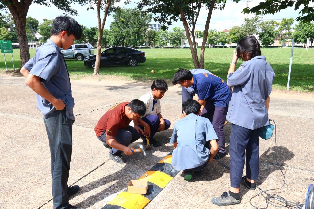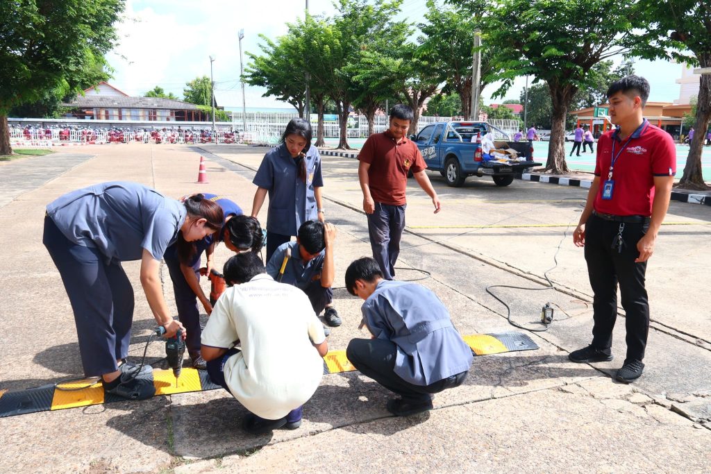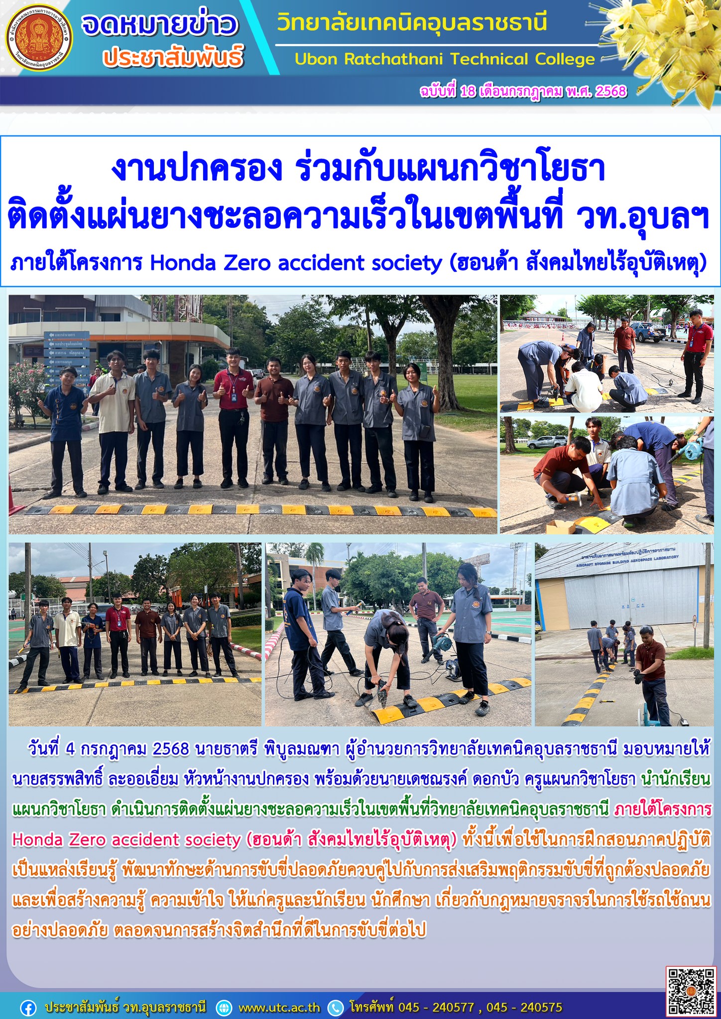 วันที่ 4 กรกฎาคม 2568 นายธาตรี พิบูลมณฑา ผู้อำนวยการวิทยาลัยเทคนิคอุบลราชธานี มอบหมายให้ นายสรรพสิทธิ์ ละออเอี่ยม หัวหน้างานปกครอง พร้อมด้วย นายเดชณรงค์ ดอกบัว ครูแผนกวิชาโยธา นำนักเรียน นักศึกษา แผนกวิชาโยธา ดำเนินการติดตั้งแผ่นยางชะลอความเร็วในเขตพื้นที่วิทยาลัยเทคนิคอุบลราชธานี ภายใต้โครงการ Honda Zero accident society (ฮอนด้า สังคมไทยไร้อุบัติเหตุ) ทั้งนี้เพื่อใช้ในการฝึกสอนภาคปฏิบัติ เป็นแหล่งเรียนรู้ พัฒนาทักษะด้านการขับขี่ปลอดภัยควบคู่ไปกับการส่งเสริมพฤติกรรมขับขี่ที่ถูกต้องและปลอดภัย และเพื่อสร้างความรู้ ความเข้าใจ ให้แก่ครูและนักเรียน นักศึกษา เกี่ยวกับกฎหมายจราจร การใช้รถใช้ถนนอย่างปลอดภัย ตลอดจนการสร้างจิตสำนึกที่ดีในการขับขี่ต่อไป