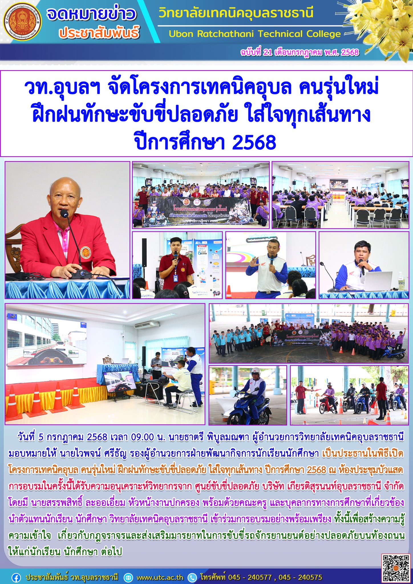 วท.อุบลฯ จัดโครงการเทคนิคอุบล คนรุ่นใหม่ ฝึกฝนทักษะขับขี่ปลอดภัย ใส่ใจทุกเส้นทาง ปีการศึกษา 2568