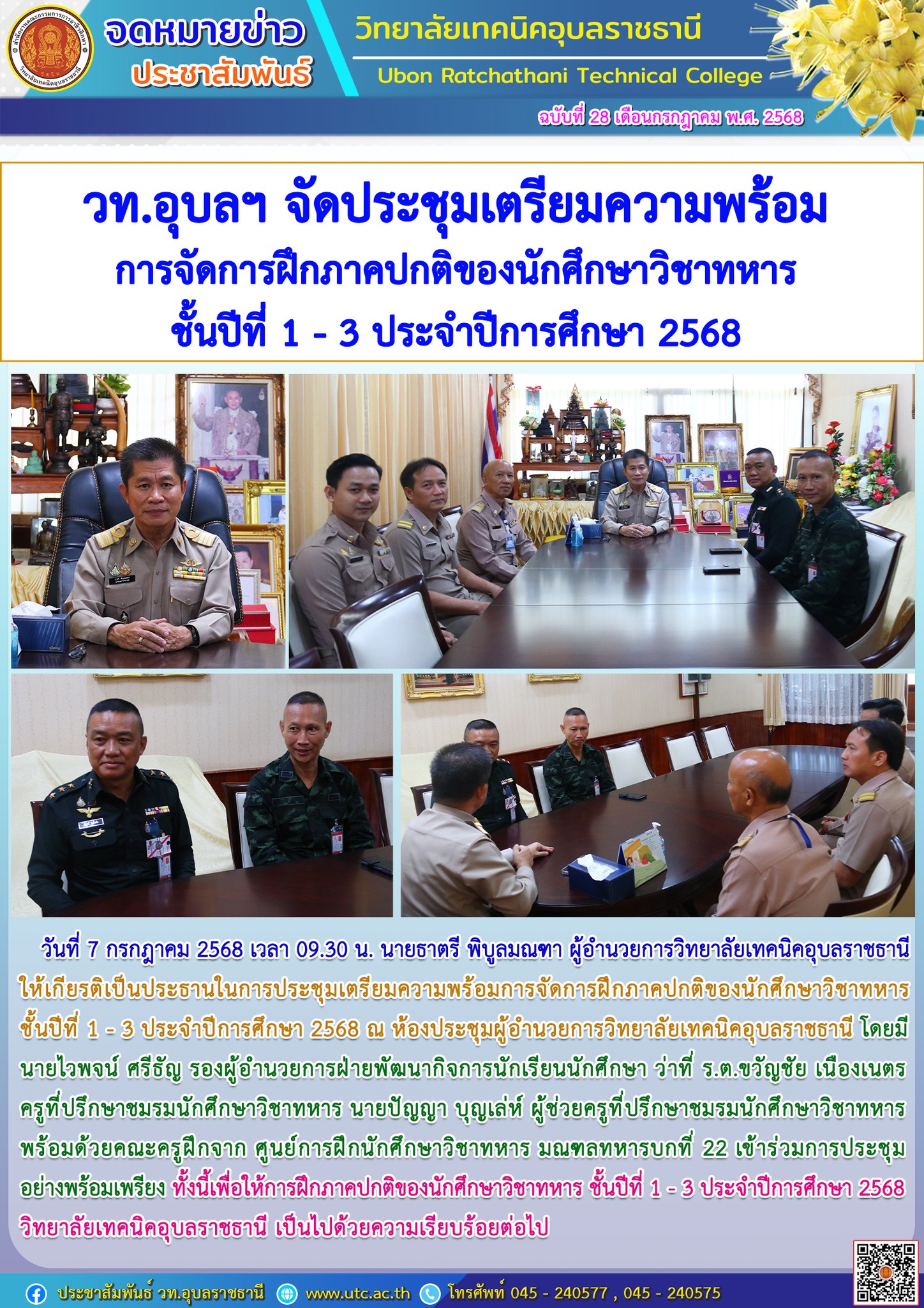 วันที่ 7 กรกฎาคม 2568 เวลา 09.30 น. นายธาตรี พิบูลมณฑา ผู้อำนวยการวิทยาลัยเทคนิคอุบลราชธานี ให้เกียรติเป็นประธานในการประชุมเตรียมความพร้อมการจัดการฝึกภาคปกติของนักศึกษาวิชาทหาร ชั้นปีที่ 1 – 3 ประจำปีการศึกษา 2568 ณ ห้องประชุมผู้อำนวยการวิทยาลัยเทคนิคอุบลราชธานี โดยมี นายไวพจน์ ศรีธัญ รองผู้อำนวยการฝ่ายพัฒนากิจการนักเรียนนักศึกษา ว่าที่ ร.ต.ขวัญชัย เนืองเนตร ครูที่ปรึกษาชมรมนักศึกษาวิชาทหาร นายปัญญา บุญเล่ห์ ผู้ช่วยครูที่ปรึกษาชมรมนักศึกษาวิชาทหาร พร้อมด้วยคณะครูฝึกจาก ศูนย์การฝึกนักศึกษาวิชาทหาร มณฑลทหารบกที่ 22 เข้าร่วมการประชุมอย่างพร้อมเพรียง ทั้งนี้เพื่อให้การฝึกภาคปกติของนักศึกษาวิชาทหาร ชั้นปีที่ 1 – 3 ประจำปีการศึกษา 2568 วิทยาลัยเทคนิคอุบลราชธานี เป็นไปด้วยความเรียบร้อยต่อไป
