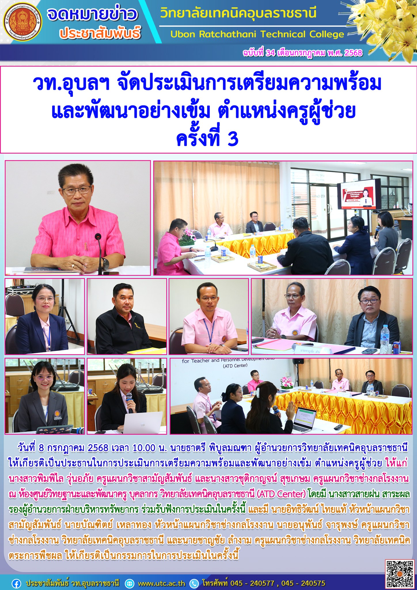 วันที่ 8 กรกฎาคม 2568 เวลา 10.00 น. นายธาตรี พิบูลมณฑา ผู้อำนวยการวิทยาลัยเทคนิคอุบลราชธานี ให้เกียรติเป็นประธานในการประเมินการเตรียมความพร้อมและพัฒนาอย่างเข้ม ตำแหน่งครูผู้ช่วย ครั้งที่ 3 ให้แก่ นางสาวพิมพิไล วุ่นอภัย ครูแผนกวิชาสามัญสัมพันธ์ และนางสาวชุติกาญจน์ สุขเกษม ครูแผนกวิชาช่างกลโรงงาน ณ ห้องศูนย์วิทยฐานะและพัฒนาครู บุคลากร วิทยาลัยเทคนิคอุบลราชธานี (ATD Center) โดยมี นางสาวสายฝน สาระผล รองผู้อำนวยการฝ่ายบริหารทรัพยากร ร่วมรับฟังการประเมินในครั้งนี้ และมี นายอิทธิวัฒน์ ไทยแท้ หัวหน้าแผนกวิชาสามัญสัมพันธ์ นายบัณฑิตย์ เหลาทอง หัวหน้าแผนกวิชาช่างกลโรงงาน นายอนุพันธ์ จารุพงษ์ ครูแผนกวิชาช่างกลโรงงาน วิทยาลัยเทคนิคอุบลราชธานี และนายชาญชัย ลำงาม ครูแผนกวิชาช่างกลโรงงาน วิทยาลัยเทคนิคตระการพืชผล ให้เกียรติเป็นกรรมการในการประเมินในครั้งนี้