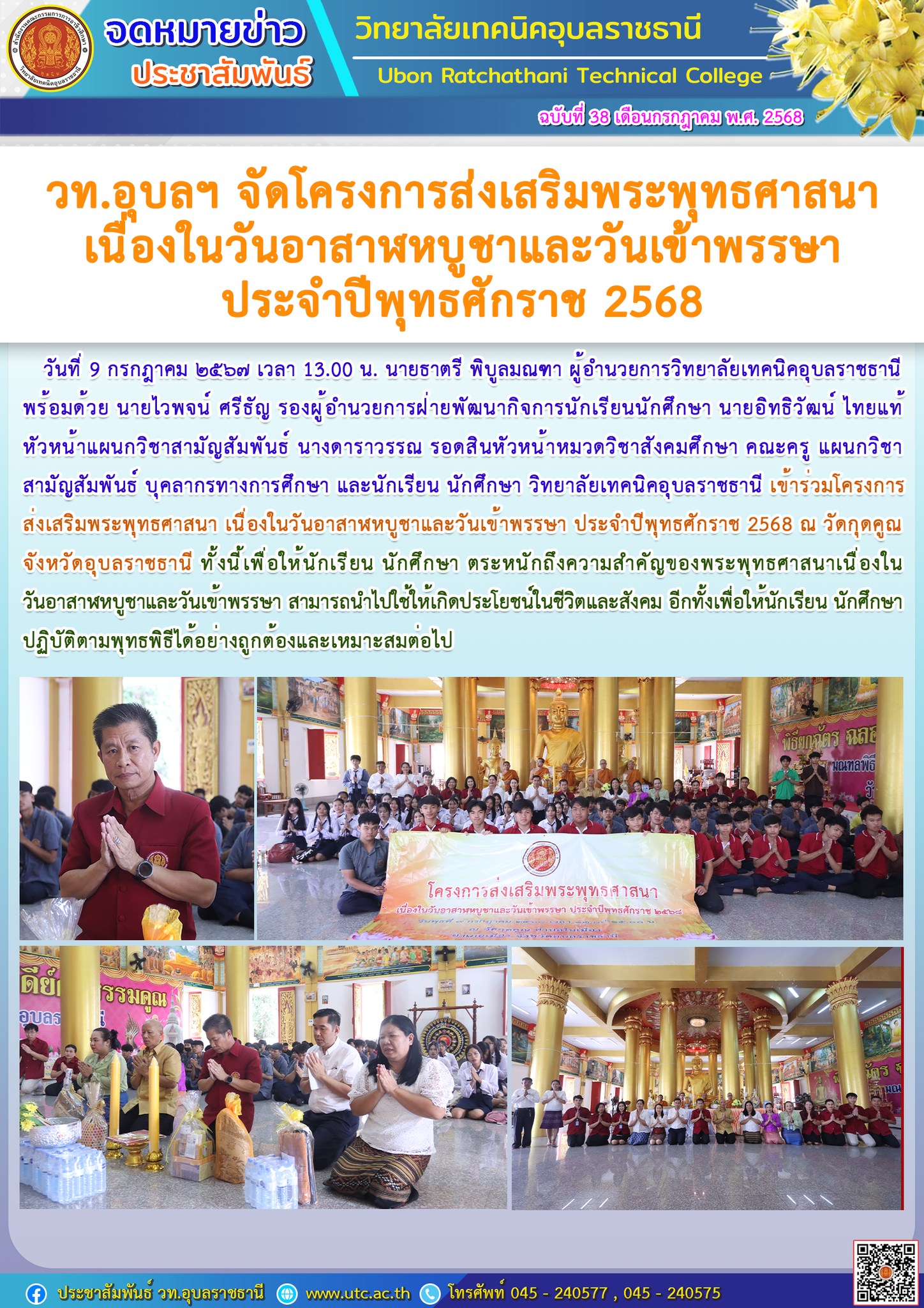 วท.อุบลฯ จัดโครงการส่งเสริมพระพุทธศาสนา เนื่องในวันอาสาฬหบูชาและวันเข้าพรรษา ประจำปีพุทธศักราช 2568