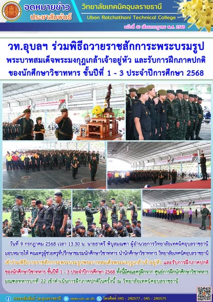 วันที่ 9 กรกฎาคม 2568 เวลา 13.30 น. นายธาตรี พิบูลมณฑา ผู้อำนวยการวิทยาลัยเทคนิคอุบลราชธานี มอบหมายให้ คณะครูผู้ช่วยครูที่ปรึกษาชมรมนักศึกษาวิชาทหาร นำนักศึกษาวิชาทหาร วิทยาลัยเทคนิคอุบลราชธานี เข้าร่วมพิธีถวายราชสักการะพระบรมรูปพระบาทสมเด็จพระมงกุฎเกล้าเจ้าอยู่หัว และรับการฝึกภาคปกติของนักศึกษาวิชาทหาร ชั้นปีที่ 1 – 3 ประจำปีการศึกษา 2568 ทั้งนี้มีคณะครูฝึกจาก ศูนย์การฝึกนักศึกษาวิชาทหาร มณฑลทหารบกที่ 22 เข้าดำเนินการฝึกภาคปกติในครั้งนี้ ณ วิทยาลัยเทคนิคอุบลราชธานี