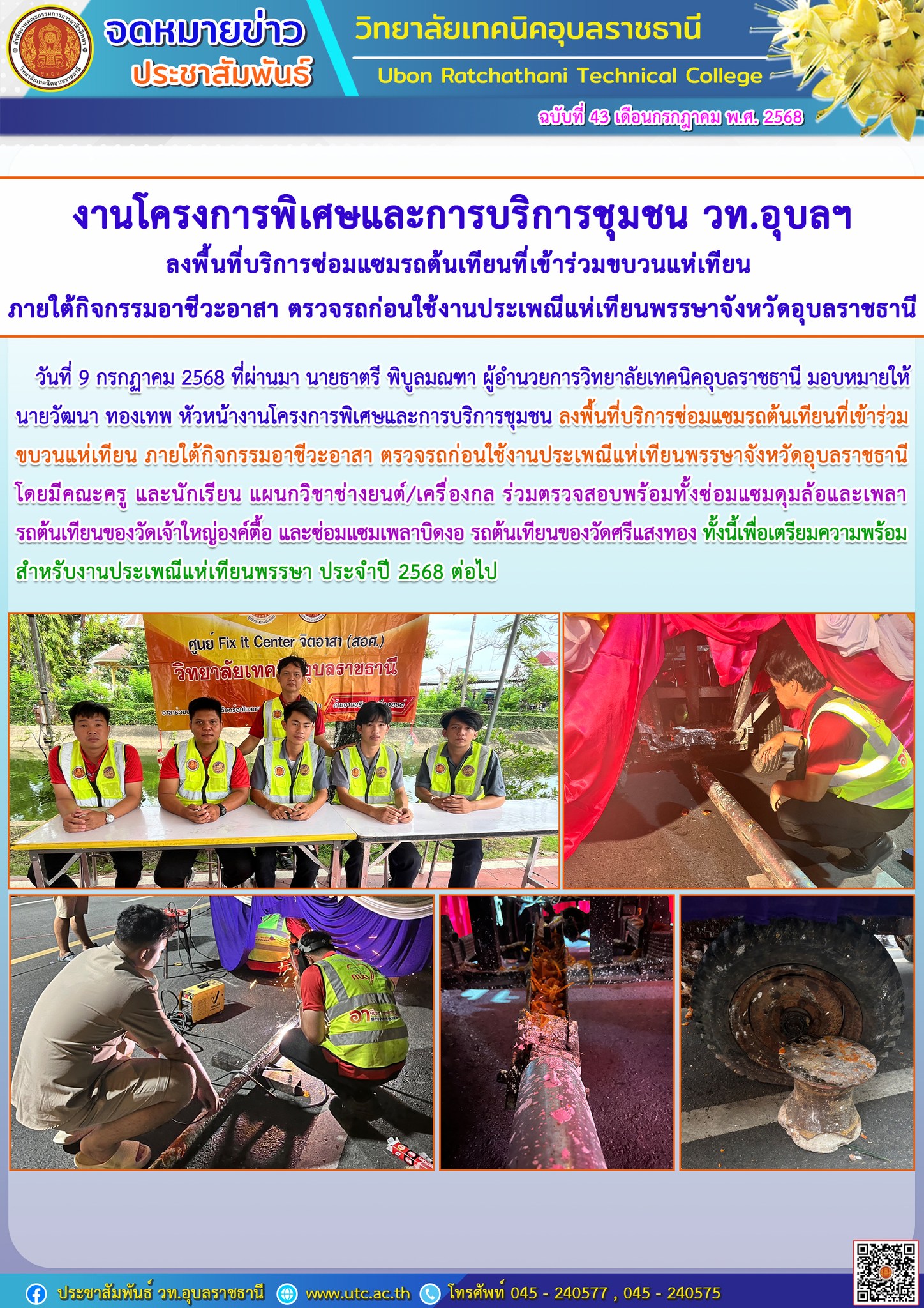 วันที่ 9 กรกฏาคม 2568 ที่ผ่านมา นายธาตรี พิบูลมณฑา ผู้อำนวยการวิทยาลัยเทคนิคอุบลราชธานี มอบหมายให้ นายวัฒนา ทองเทพ หัวหน้างานโครงการพิเศษและการบริการชุมชน ลงพื้นที่บริการซ่อมแซมรถต้นเทียนที่เข้าร่วมขบวนแห่เทียน ภายใต้กิจกรรมอาชีวะอาสา ตรวจรถก่อนใช้งานประเพณีแห่เทียนพรรษาจังหวัดอุบลราชธานี โดยมีคณะครู และนักเรียน แผนกวิชาช่างยนต์/เครื่องกล ร่วมตรวจสอบโครงสร้างพร้อมทั้งซ่อมแซมดุมล้อและเพลา รถต้นเทียนของวัดเจ้าใหญ่องค์ตื้อ และซ่อมแซมเพลาบิดงอ รถต้นเทียนของวัดศรีแสงทอง ทั้งนี้เพื่อเตรียมความพร้อมสำหรับงานประเพณีแห่เทียนพรรษา ประจำปี 2568 ต่อไป