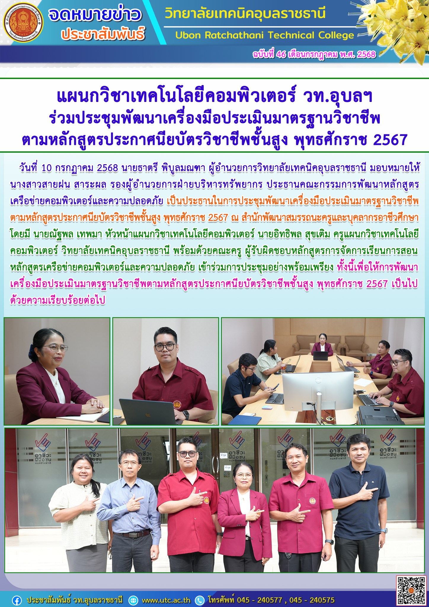 แผนกวิชาเทคโนโลยีคอมพิวเตอร์ วท.อุบลฯ ร่วมประชุมพัฒนาเครื่องมือประเมินมาตรฐานวิชาชีพตามหลักสูตรประกาศนียบัตรวิชาชีพชั้นสูง พุทธศักราช 2567