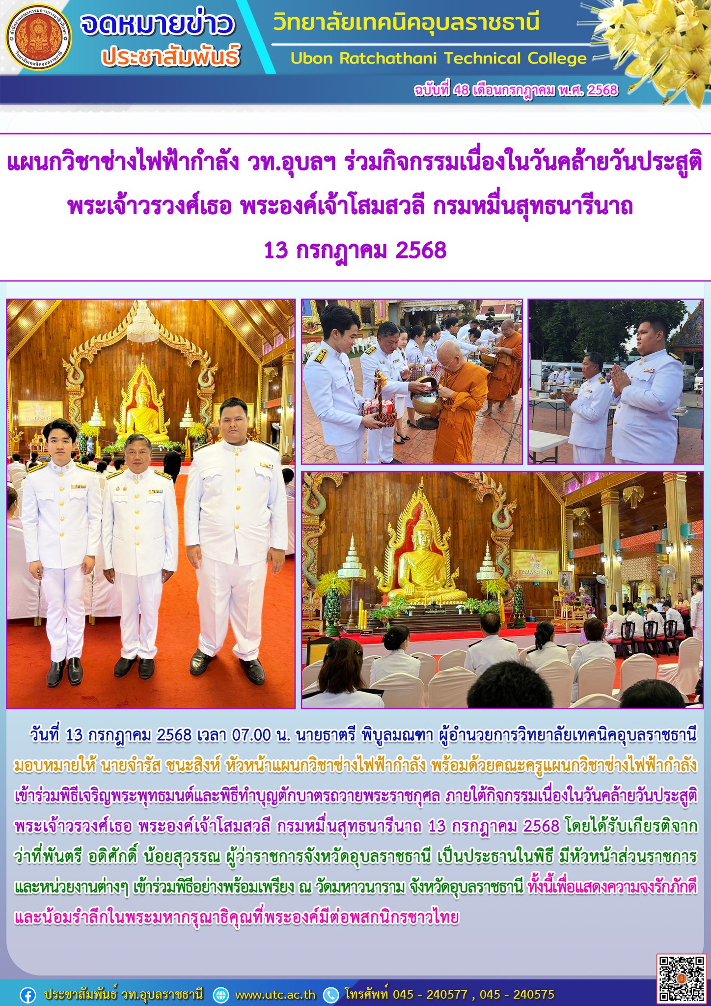 วันที่ 13 กรกฎาคม 2568 เวลา 07.00 น. นายธาตรี พิบูลมณฑา ผู้อำนวยการวิทยาลัยเทคนิคอุบลราชธานี มอบหมายให้ นายจำรัส ชนะสิงห์ หัวหน้าแผนกวิชาช่างไฟฟ้ากำลัง พร้อมด้วยคณะครูแผนกวิชาช่างไฟฟ้ากำลัง เข้าร่วมพิธีเจริญพระพุทธมนต์และพิธีทำบุญตักบาตรถวายพระราชกุศล ภายใต้กิจกรรมเนื่องในวันคล้ายวันประสูติพระเจ้าวรวงศ์เธอ พระองค์เจ้าโสมสวลี กรมหมื่นสุทธนารีนาถ 13 กรกฎาคม 2568 โดยได้รับเกียรติจาก ว่าที่พันตรี อดิศักดิ์ น้อยสุวรรณ ผู้ว่าราชการจังหวัดอุบลราชธานี เป็นประธานในพิธี มีหัวหน้าส่วนราชการ และหน่วยงานต่างๆ เข้าร่วมพิธีอย่างพร้อมเพรียง ณ วัดมหาวนาราม จังหวัดอุบลราชธานี ทั้งนี้เพื่อแสดงความจงรักภักดี และน้อมรำลึกในพระมหากรุณาธิคุณที่พระองค์มีต่อพสกนิกรชาวไทย