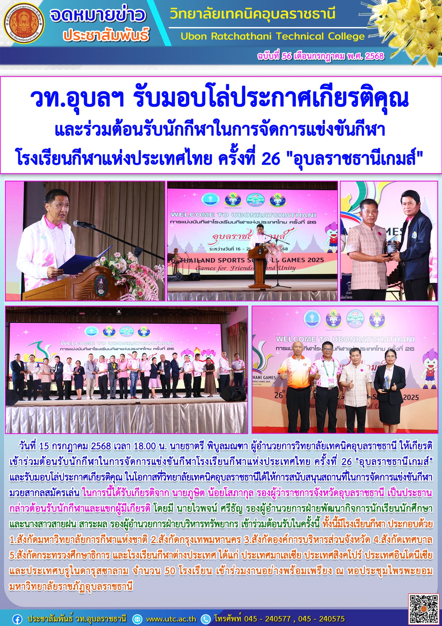 วันที่ 15 กรกฎาคม 2568 เวลา 18.00 น. นายธาตรี พิบูลมณฑา ผู้อำนวยการวิทยาลัยเทคนิคอุบลราชธานี ให้เกียรติเข้าร่วมต้อนรับนักกีฬาในการจัดการแข่งขันกีฬาโรงเรียนกีฬาแห่งประเทศไทย ครั้งที่ 26 “อุบลราชธานีเกมส์” และรับมอบโล่ประกาศเกียรติคุณ ในโอกาสที่วิทยาลัยเทคนิคอุบลราชธานีได้ให้การสนับสนุนสถานที่ในการจัดการแข่งขันกีฬามวยสากลสมัครเล่น ในการนี้ได้รับเกียรติจาก นายภูษิต น้อยโสภากุล รองผู้ว่าราชการจังหวัดอุบลราชธานี เป็นประธานกล่าวต้อนรับนักกีฬาและแขกผู้มีเกียรติ โดยมี นายไวพจน์ ศรีธัญ รองผู้อำนวยการฝ่ายพัฒนากิจการนักเรียนนักศึกษา และนางสาวสายฝน สาระผล รองผู้อำนวยการฝ่ายบริหารทรัพยากร เข้าร่วมต้อนรับในครั้งนี้ ทั้งนี้มีโรงเรียนกีฬา ประกอบด้วย 1.สังกัดมหาวิทยาลัยการกีฬาแห่งชาติ 2.สังกัดกรุงเทพมหานคร 3.สังกัดองค์การบริหารส่วนจังหวัด 4.สังกัดเทศบาล 5.สังกัดกระทรวงศึกษาธิการ และโรงเรียนกีฬาต่างประเทศ ได้แก่ ประเทศมาเลเซีย ประเทศสิงคโปร์ ประเทศอินโดนีเซีย และประเทศบรูไนดารุสซาลาม จำนวน 50 โรงเรียน เข้าร่วมงานอย่างพร้อมเพรียง ณ หอประชุมไพรพะยอม มหาวิทยาลัยราชภัฏอุบลราชธานี