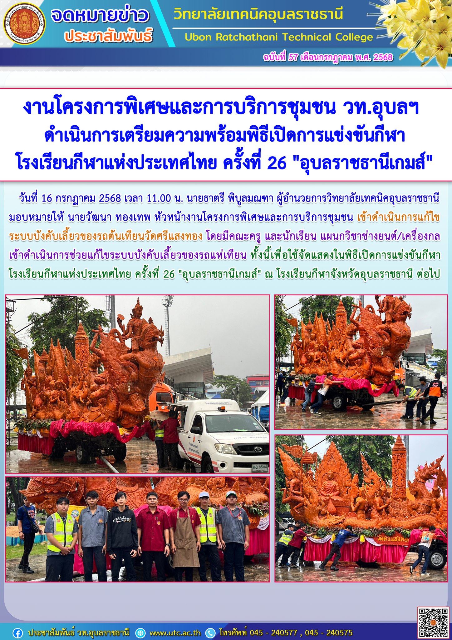 วันที่ 16 กรกฏาคม 2568 เวลา 11.00 น. นายธาตรี พิบูลมณฑา ผู้อำนวยการวิทยาลัยเทคนิคอุบลราชธานี มอบหมายให้ นายวัฒนา ทองเทพ หัวหน้างานโครงการพิเศษและการบริการชุมชน เข้าดำเนินการแก้ไขระบบบังคับเลี้ยวรถต้นเทียน ซึ่งวัดศรีแสงทองได้ขอความอนุเคราะห์งานโครงการพิเศษและการบริการชุมชน วิทยาลัยเทคนิคอุบลราชธานี ในการช่วยแก้ไขระบบบังคับเลี้ยวรถต้นเทียนในครั้งนี้ โดยมีคณะครู นำนักเรียน แผนกวิชาช่างยนต์/เครื่องกล เข้าดำเนินการช่วยแก้ไขระบบบังคับเลี้ยวของรถแห่เทียน ทั้งนี้เพื่อร่วมจัดแสดงในพิธีเปิดการแข่งขันกีฬาโรงเรียนกีฬาแห่งประเทศไทย ครั้งที่ 26 “อุบลราชธานีเกมส์” ณ โรงเรียนกีฬาจังหวัดอุบลราชธานี ต่อไป