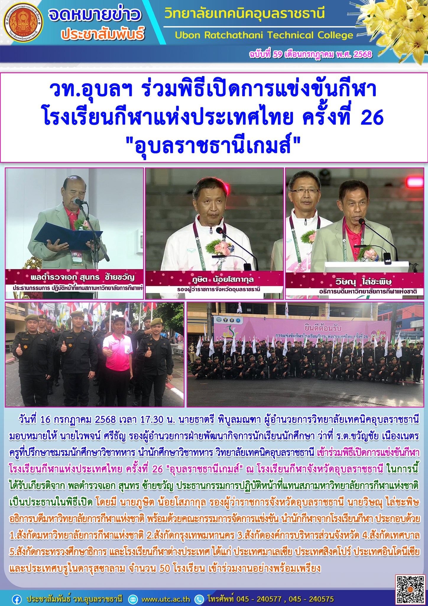 วันที่ 16 กรกฏาคม 2568 เวลา 17.30 น. นายธาตรี พิบูลมณฑา ผู้อำนวยการวิทยาลัยเทคนิคอุบลราชธานี มอบหมายให้ นายไวพจน์ ศรีธัญ รองผู้อำนวยการฝ่ายพัฒนากิจการนักเรียนนักศึกษา ว่าที่ ร.ต.ขวัญชัย เนืองเนตร ครูที่ปรึกษาชมรมนักศึกษาวิชาทหาร นำนักศึกษา วิทยาลัยเทคนิคอุบลราชธานี เข้าร่วมพิธีเปิดการแข่งขันกีฬาโรงเรียนกีฬาแห่งประเทศไทย ครั้งที่ 26 “อุบลราชธานีเกมส์” ณ โรงเรียนกีฬาจังหวัดอุบลราชธานี ในการนี้ได้รับเกียรติจาก พลตำรวจเอก สุนทร ซ้ายขวัญ ประธานกรรมการปฏิบัติหน้าที่แทนสภามหาวิทยาลัยการกีฬาแห่งชาติ เป็นประธานในพิธีเปิด โดยมี นายภูษิต น้อยโสภากุล รองผู้ว่าราชการจังหวัดอุบลราชธานี นายวิษณุ ไล่ชะพิษ อธิการบดีมหาวิทยาลัยการกีฬาแห่งชาติ พร้อมด้วยคณะกรรมการจัดการเเข่งขัน นำนักกีฬาจากโรงเรียนกีฬา ประกอบด้วย 1.สังกัดมหาวิทยาลัยการกีฬาแห่งชาติ 2.สังกัดกรุงเทพมหานคร 3.สังกัดองค์การบริหารส่วนจังหวัด 4.สังกัดเทศบาล 5.สังกัดกระทรวงศึกษาธิการ และโรงเรียนกีฬาต่างประเทศ ได้แก่ ประเทศมาเลเซีย ประเทศสิงคโปร์ ประเทศอินโดนีเซีย และประเทศบรูไนดารุสซาลาม จำนวน 50 โรงเรียน เข้าร่วมงานอย่างพร้อมเพรียง