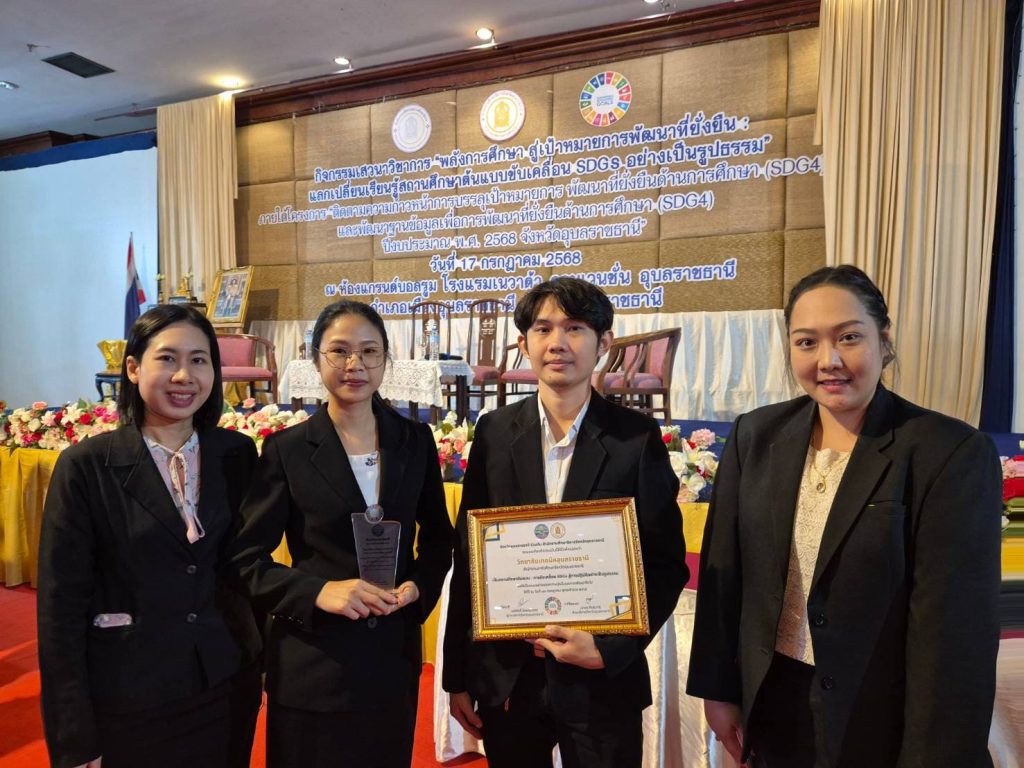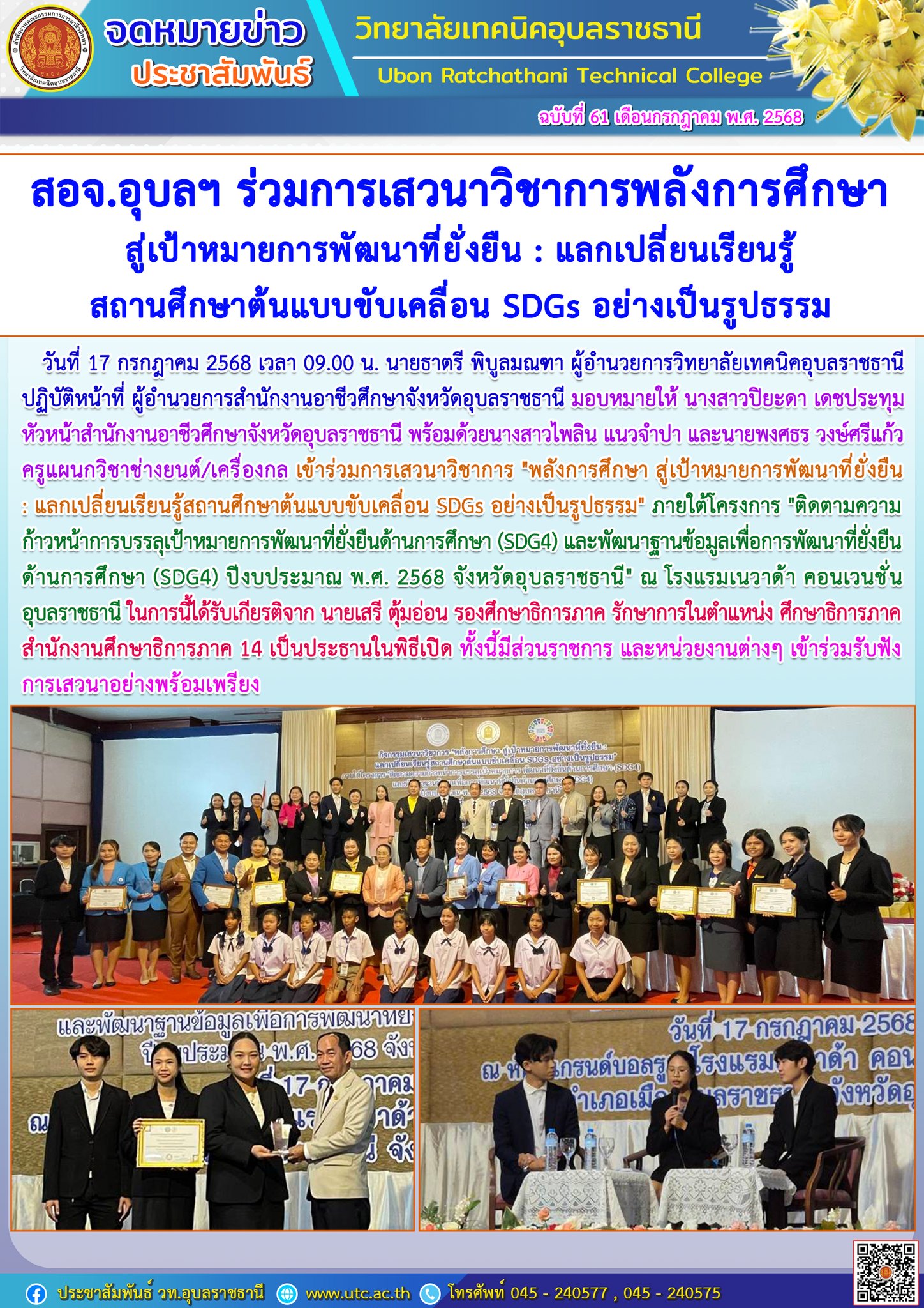 วันที่ 17 กรกฎาคม 2568 เวลา 09.00 น. นายธาตรี พิบูลมณฑา ผู้อำนวยการวิทยาลัยเทคนิคอุบลราชธานี ปฏิบัติหน้าที่ ผู้อำนวยการสำนักงานอาชีวศึกษาจังหวัดอุบลราชธานี มอบหมายให้ นางสาวปิยะดา เดชประทุม หัวหน้าสำนักงานอาชีวศึกษาจังหวัดอุบลราชธานี พร้อมด้วยนางสาวไพลิน แนวจำปา และนายพงศธร วงษ์ศรีแก้ว ครูแผนกวิชาช่างยนต์/เครื่องกล เข้าร่วมการเสวนาวิชาการ “พลังการศึกษา สู่เป้าหมายการพัฒนาที่ยั่งยืน : แลกเปลี่ยนเรียนรู้สถานศึกษาต้นแบบขับเคลื่อน SDGs อย่างเป็นรูปธรรม ” ภายใต้โครงการ “ติดตามความก้าวหน้าการบรรลุเป้าหมายการพัฒนาที่ยั่งยืนด้านการศึกษา (SDG4) และพัฒนาฐานข้อมูลเพื่อการพัฒนาที่ยั่งยืนด้านการศึกษา (SDG4) ปีงบประมาณ พ.ศ. 2568 จังหวัดอุบลราชธานี” ณ โรงแรมเนวาด้า คอนเวนชั่น อุบลราชธานี ในการนี้ได้รับเกียรติจาก นายเสรี ตุ้มอ่อน รองศึกษาธิการภาค รักษาการในตำแหน่ง ศึกษาธิการภาค สำนักงานศึกษาธิการภาค 14 เป็นประธานในพิธีเปิด ทั้งนี้มีส่วนราชการ และหน่วยงานต่างๆ เข้าร่วมรับฟังการเสวนาอย่างพร้อมเพรียง