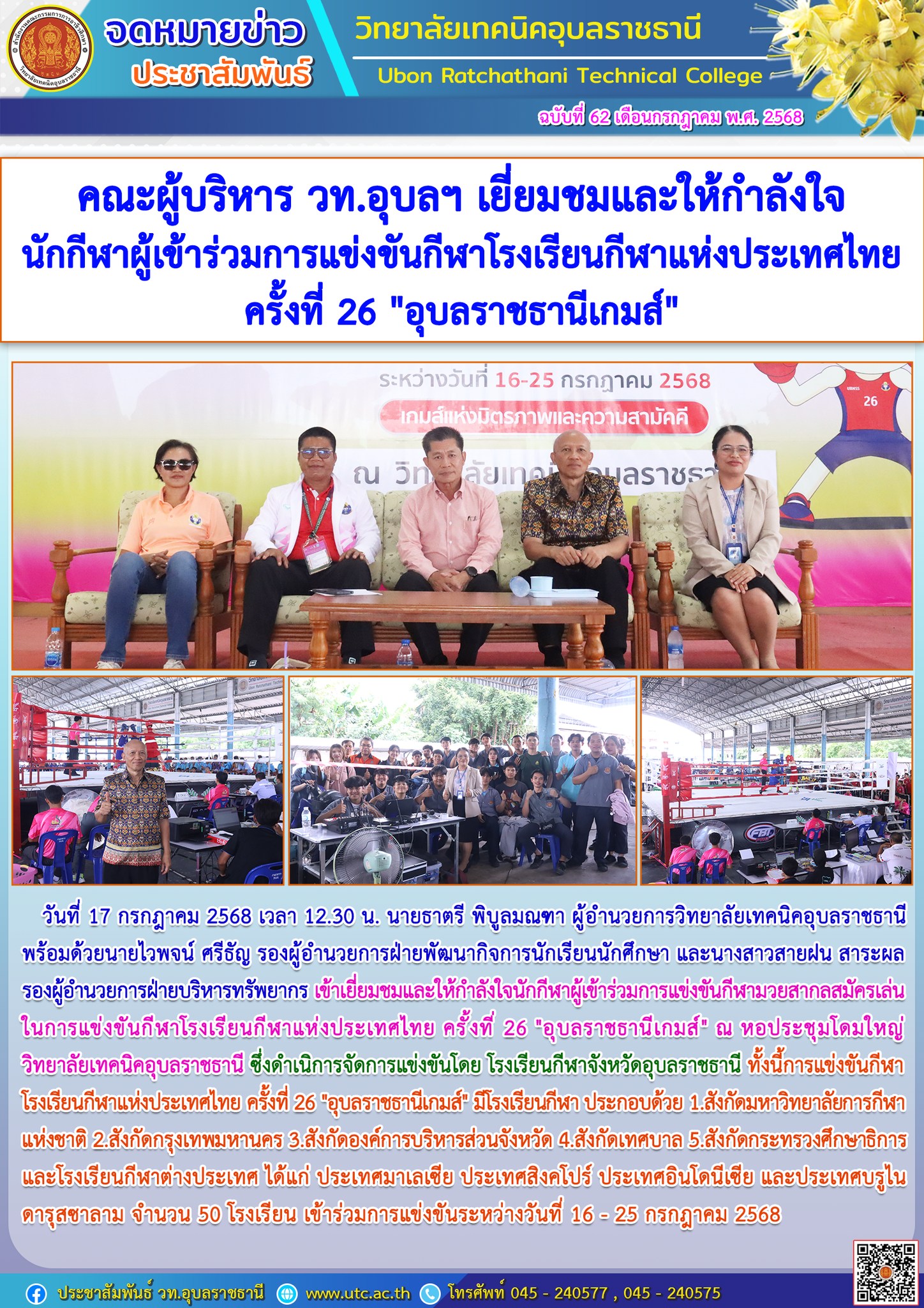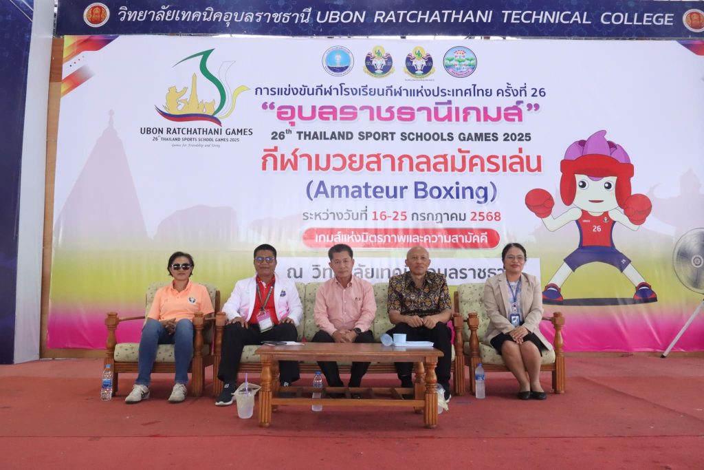 วันที่ 17 กรกฎาคม 2568 เวลา 12.30 น. นายธาตรี พิบูลมณฑา ผู้อำนวยการวิทยาลัยเทคนิคอุบลราชธานี พร้อมด้วยนายไวพจน์ ศรีธัญ รองผู้อำนวยการฝ่ายพัฒนากิจการนักเรียนนักศึกษา และนางสาวสายฝน สาระผล รองผู้อำนวยการฝ่ายบริหารทรัพยากร เยี่ยมชมและให้กำลังใจนักกีฬาผู้เข้าร่วมการแข่งขันกีฬามวยสากลสมัครเล่นในการแข่งขันกีฬาโรงเรียนกีฬาแห่งประเทศไทย ครั้งที่ 26 “อุบลราชธานีเกมส์” ณ หอประชุมโดมใหญ่ วิทยาลัยเทคนิคอุบลราชธานี ซึ่งดำเนิการจัดการแข่งขันโดย โรงเรียนกีฬาจังหวัดอุบลราชธานี ทั้งนี้การแข่งขันกีฬาโรงเรียนกีฬาแห่งประเทศไทย ครั้งที่ 26 “อุบลราชธานีเกมส์” มีโรงเรียนกีฬา ประกอบด้วย 1.สังกัดมหาวิทยาลัยการกีฬาแห่งชาติ 2.สังกัดกรุงเทพมหานคร 3.สังกัดองค์การบริหารส่วนจังหวัด 4.สังกัดเทศบาล 5.สังกัดกระทรวงศึกษาธิการ และโรงเรียนกีฬาต่างประเทศ ได้แก่ ประเทศมาเลเซีย ประเทศสิงคโปร์ ประเทศอินโดนีเซีย และประเทศบรูไนดารุสซาลาม จำนวน 50 โรงเรียน เข้าร่วมการแข่งขันเข้าร่วมการแข่งขันระหว่างวันที่ 16 – 25 กรกฎาคม 2568