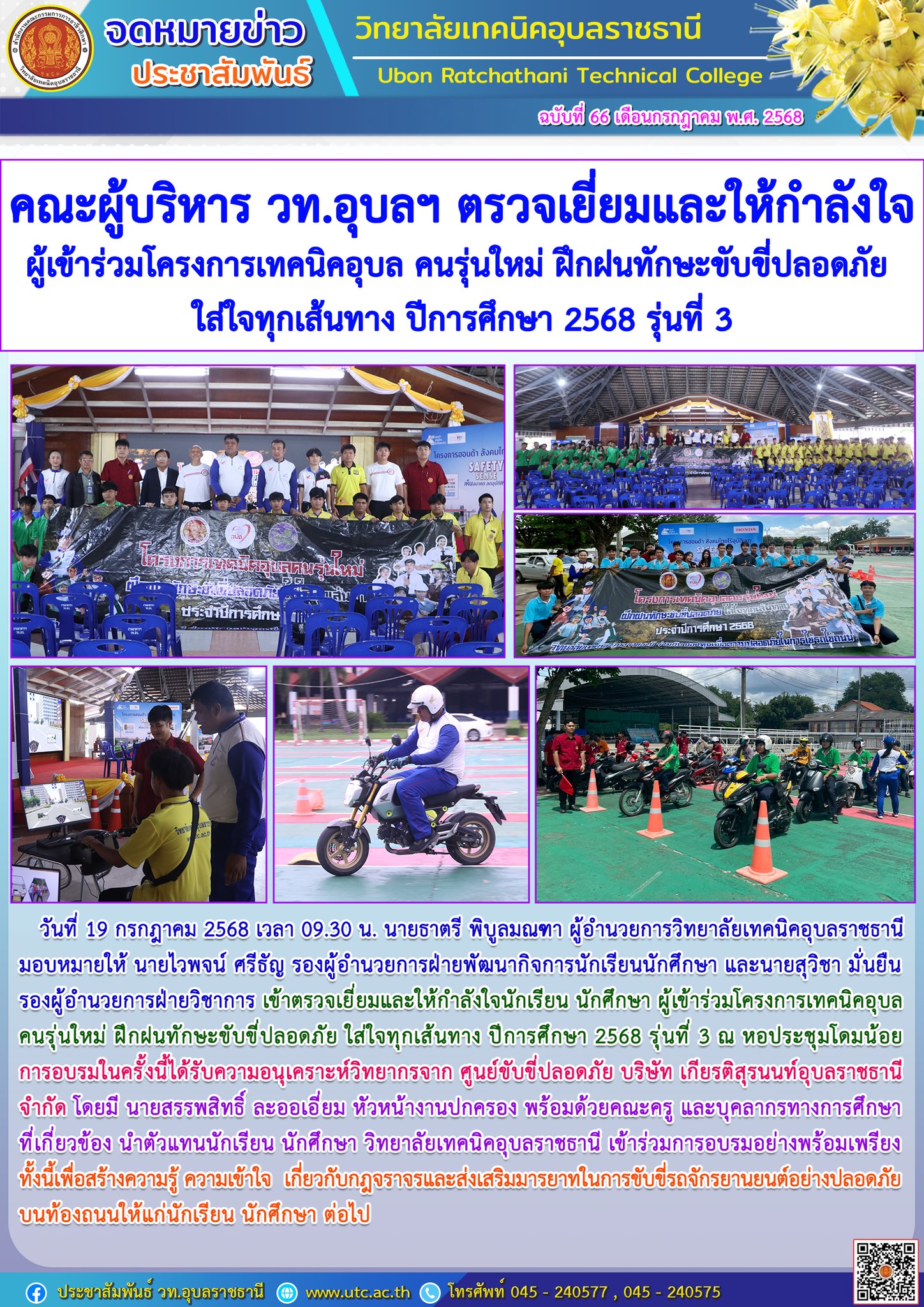 คณะผู้บริหาร วท.อุบลฯ เยี่ยมและให้กำลังใจผู้เข้าร่วมโครงการ คนรุ่นใหม่ ฝึกฝนทักษะขับขี่ปลอดภัย ใส่ใจทุกเส้นทาง ปีการศึกษา 2568 รุ่นที่ 3