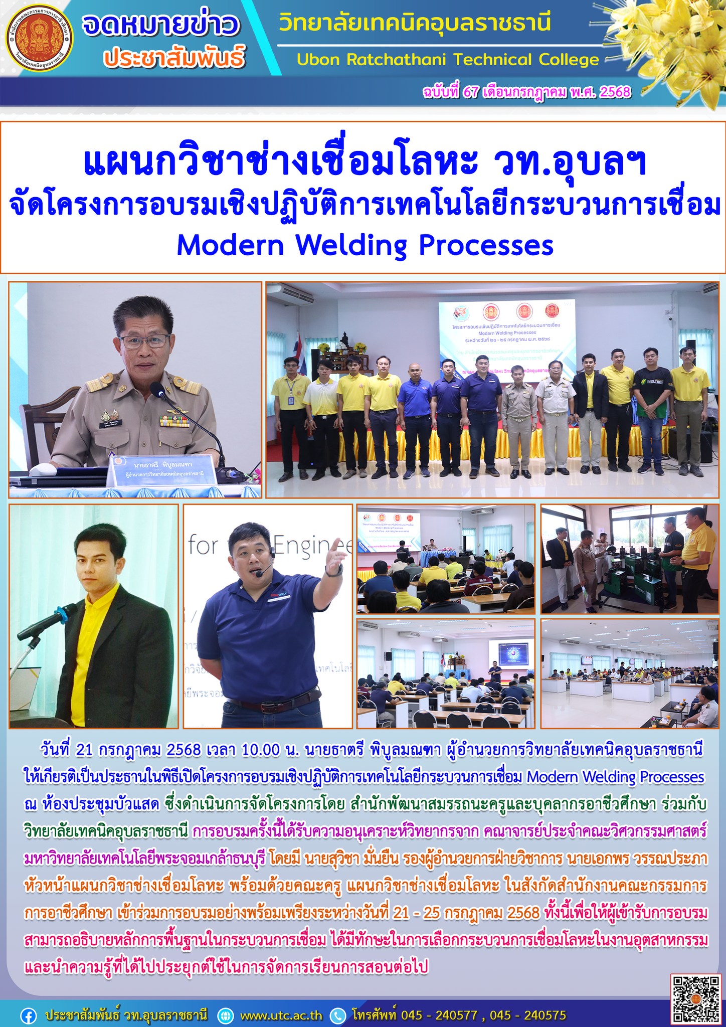 แผนกวิชาช่างเชื่อมโลหะ วท.อุบลฯ จัดโครงการอบรมเชิงปฏิบัติการเทคโนโลยีกระบวนการเชื่อม Modern Welding Processes