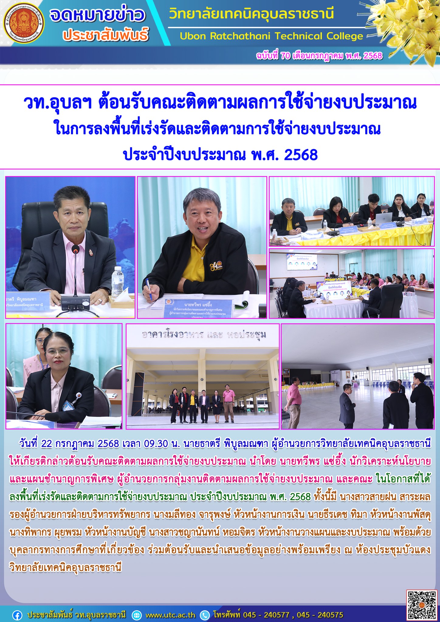 วันที่ 22 กรกฎาคม 2568 เวลา 09.30 น. นายธาตรี พิบูลมณฑา ผู้อำนวยการวิทยาลัยเทคนิคอุบลราชธานี ให้เกียรติกล่าวต้อนรับคณะติดตามผลการใช้จ่ายงบประมาณ นำโดย นายทวีพร แซ่อึ้ง นักวิเคราะห์นโยบายและแผนชำนาญการพิเศษ ผู้อำนวยการกลุ่มงานติดตามผลการใช้จ่ายงบประมาณ และคณะ ในโอกาสที่ได้ลงพื้นที่เร่งรัดและติดตามการใช้จ่ายงบประมาณ ประจำปีงบประมาณ พ.ศ. 2568 ทั้งนี้มี นางสาวสายฝน สาระผล รองผู้อำนวยการฝ่ายบริหารทรัพยากร นางมลีทอง จารุพงษ์ หัวหน้างานการเงิน นายธีรเดช ทิมา หัวหน้างานพัสดุ นางทิพากร ผุยพรม หัวหน้างานบัญชี นางสาวชญานันทน์ หอมจิตร หัวหน้างานวางแผนและงบประมาณ พร้อมด้วยบุคลากรทางการศึกษาที่เกี่ยวข้อง ร่วมต้อนรับและนำเสนอข้อมูลอย่างพร้อมเพรียง ณ ห้องประชุมบัวแดง วิทยาลัยเทคนิคอุบลราชธานี