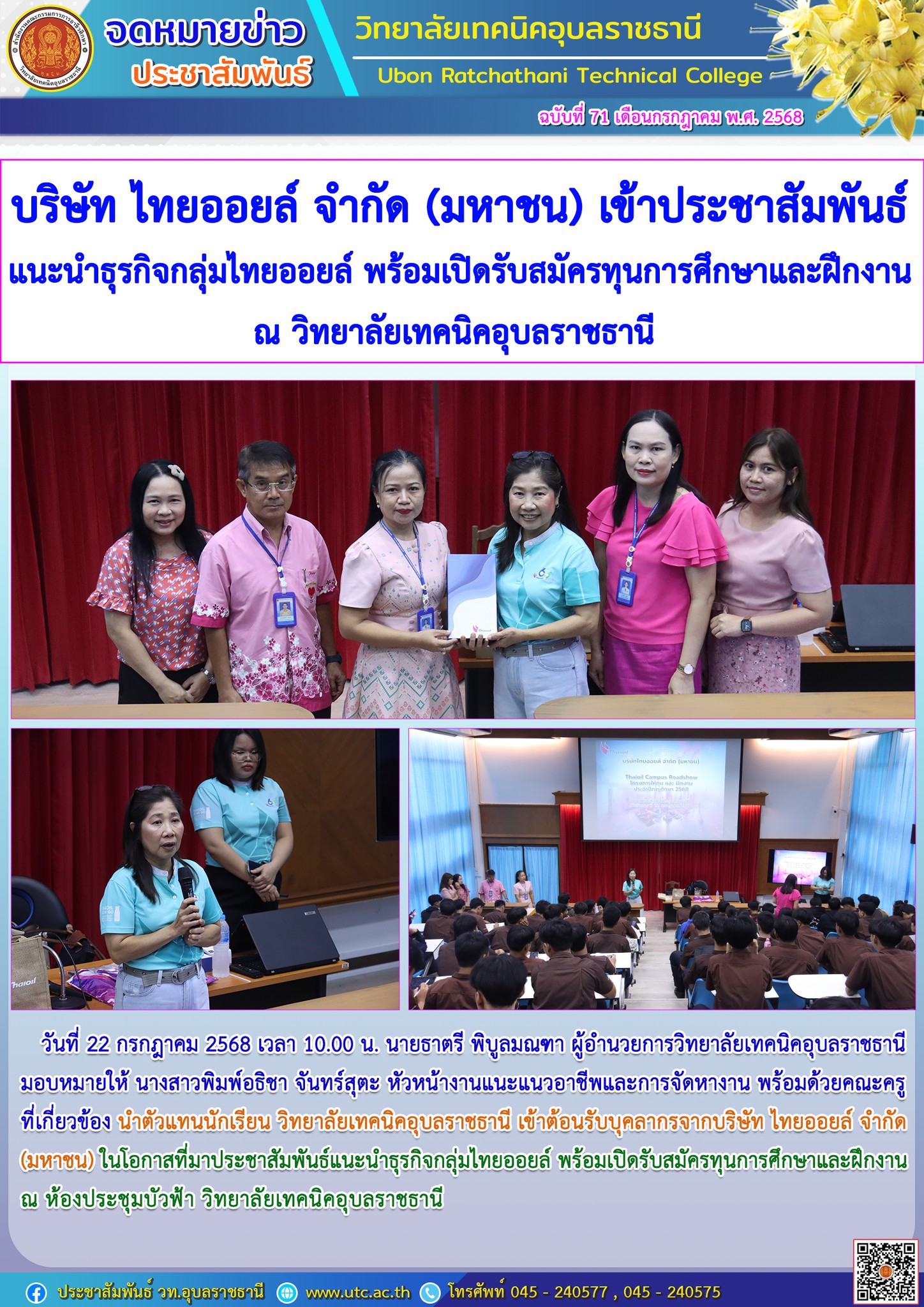 บริษัท ไทยออยล์ จำกัด (มหาชน) เข้าประชาสัมพันธ์แนะนำธุรกิจกลุ่มไทยออยล์ พร้อมเปิดรับสมัครทุนการศึกษาและฝึกงาน ณ วิทยาลัยเทคนิคอุบลราชธานี
