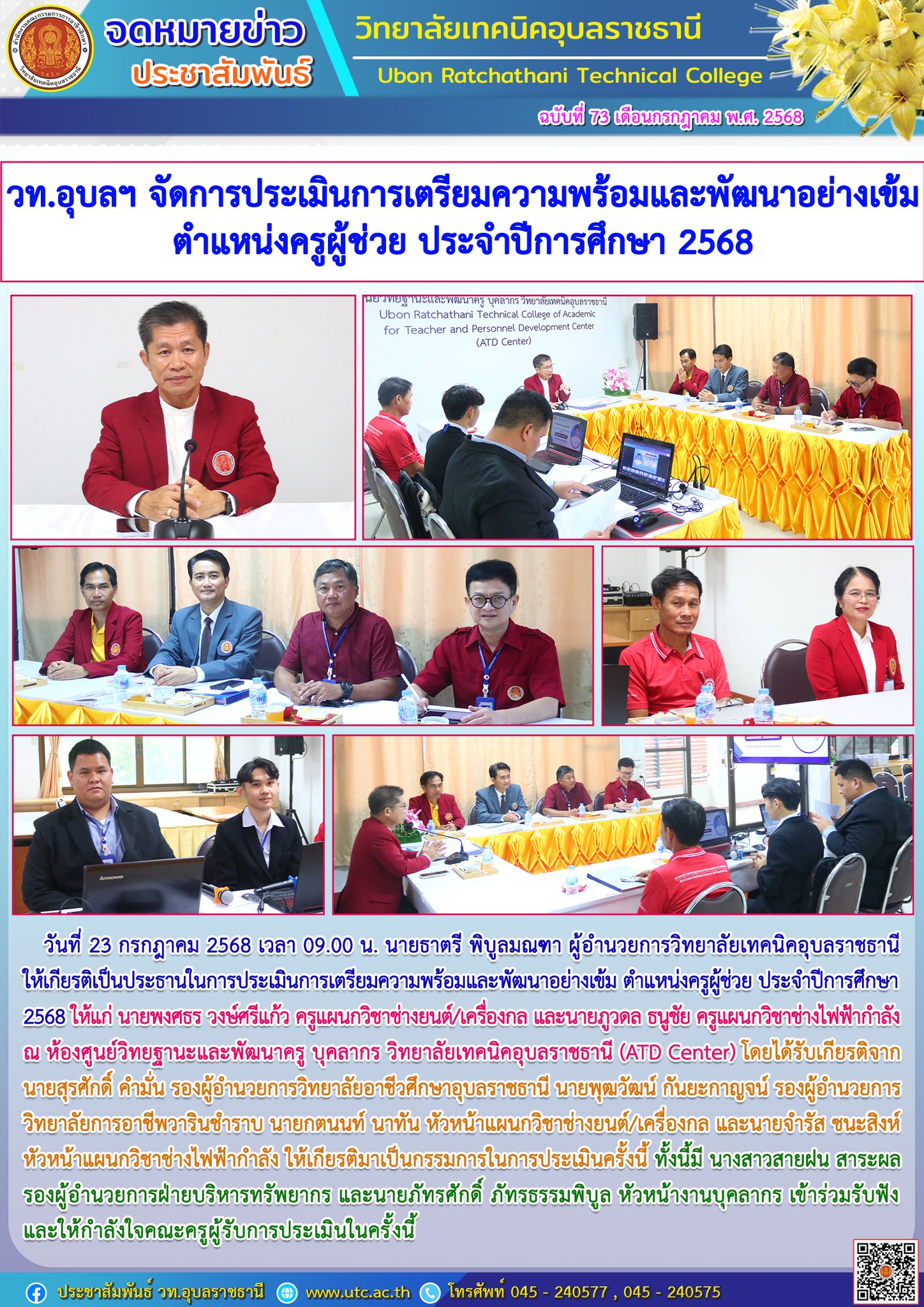 วันที่ 23 กรกฎาคม 2568 เวลา 09.00 น. นายธาตรี พิบูลมณฑา ผู้อำนวยการวิทยาลัยเทคนิคอุบลราชธานี ให้เกียรติเป็นประธานในการประเมินการเตรียมความพร้อมและพัฒนาอย่างเข้ม ตำแหน่งครูผู้ช่วย ประจำปีการศึกษา 2568 ให้แก่ นายพงศธร วงษ์ศรีแก้ว ครูแผนกวิชาช่างยนต์/เครื่องกล และนายภูวดล ธนูชัย ครูแผนกวิชาช่างไฟฟ้ากำลัง ณ ห้องศูนย์วิทยฐานะและพัฒนาครู บุคลากร วิทยาลัยเทคนิคอุบลราชธานี (ATD Center) โดยได้รับเกียรติจาก นายสุรศักดิ์ คำมั่น รองผู้อำนวยการวิทยาลัยอาชีวศึกษาอุบลราชธานี นายพุฒวัฒน์ กันยะกาญจน์ รองผู้อำนวยการวิทยาลัยการอาชีพวารินชำราบ นายกตนนท์ นาทัน หัวหน้าแผนกวิชาช่างยนต์/เครื่องกล และนายจำรัส ชนะสิงห์ หัวหน้าแผนกวิชาช่างไฟฟ้ากำลัง ให้เกียรติมาเป็นกรรมการในการประเมินครั้งนี้ ทั้งนี้มี นางสาวสายฝน สาระผล รองผู้อำนวยการฝ่ายบริหารทรัพยากร และนายภัทรศักดิ์ ภัทรธรรมพิบูล หัวหน้างานบุคลากร เข้าร่วมรับฟังและให้กำลังใจคณะครูผู้รับการประเมินในครั้งนี้